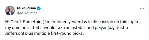 The Vikings 11th and 23rd, plus Justin Jefferson? If I'm in Wolf's situation (and it's only by virtue of the fact his dad ran the Packers and mine worked for the phone company that I am not), I'm not telling Minnesota to send the secure document right over so I can e-sign it. But it's buying them more time on the phone while I see if I can weasel a future 2nd or 3rd. But anything less than the going rate that San Francisco established three years ago to move up to No. 3, which was the 12th plus two future 1sts, is a total non-starter. It would be a "Tell me you're not serious without saying you're not serious" scenario. And an insult to my job skills.