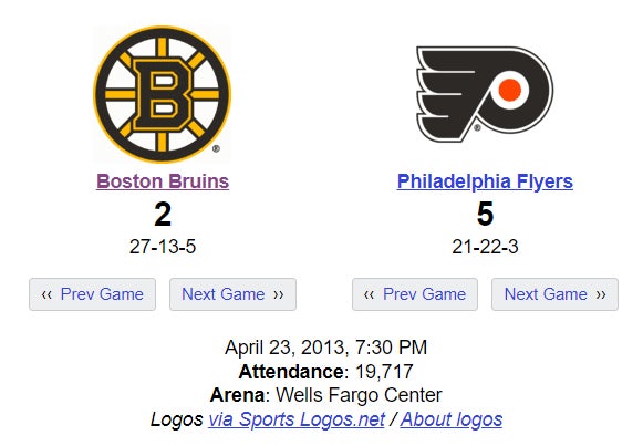 Tough night for the Bruins in the shortened 2013 season. Like the BoSox, they'd find their way to the championship series as well before falling victim to the legendary Chicago Blackhawks. But, this was a "some things are bigger than sports" kinda night as it turns out this was the first road game for the Bruins after the Boston Marathon Bombing. Philly gave them a nice pre-game tribute with a banner reading "From One Tough Town to Another" before an influx of "As a Flyers fan," tweets crashed Twitter's servers (I'm assuming).