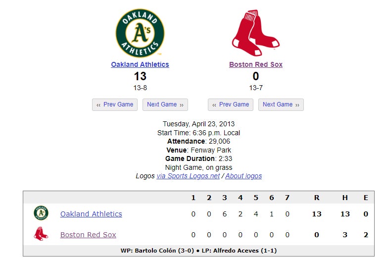 Yes, that's right, the Oakland A's were at one point good at baseball. However, the astute observer will notice this game only lasted seven innings leaving one to wonder if a mercy rule was actually called. Well, you could say God himself went ahead and mercy ruled this one via weather leaving the Red Sox with the home double-digit shutout L. It was so abysmal the Red Sox announced that anyone with a ticket stub could go to the game the following day for free. Like a brunch spot offering you a free meal on your next visit after a cockroach runs off your plate as it's set, these sick fucks decided the way to make it right with fans was to make them all come back for more.