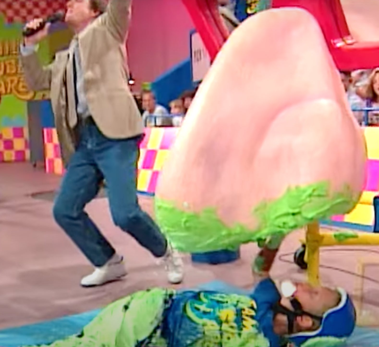 That's right, my childhood dream came true. I got to be a contestant on the messiest kid's show of all time. Before the show you could put your name in a fish bowl, and at random they'd draw a name to come up and participate. I was lucky enough to be picked, and I got to catch catapulted whipped cream pies inside a pair of massive clown overalls. I was truly living the dream. BUT, it got me thinking. Of all the Nickelodeon game shows I would have cut my arm off to participate in when I was a kid, what final challenge from the Big 3 Nickelodeon game shows would I want to do the most?