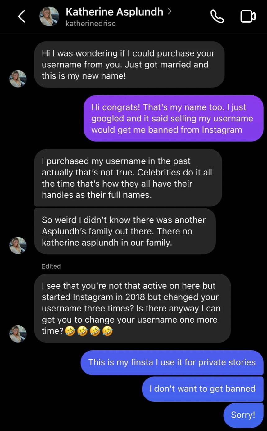 Katherine Driscoll Asplundh, recently married to Asplundh heir Cabot Asplundh, wanted to update her Instagram handle with that shiny, new last name real bad. Asplundh does vegetation management, engineering, and utility infrastructure businesses & are one of the top 100 private companies in the U.S. worth over $5.42B. (Fun fact, Dr. Oz also married into this family but that's neither here nor there so anyways back to Katherine...). Unfortunately there was another, likely lower tax-bracketed, Katherine Asplundh already out there who was using the handle. Mrs. Asplundh clearly wasn't used to not getting her way and decided she was still gonna go for it by trying to intimidate the other woman who dared have the same name as her.