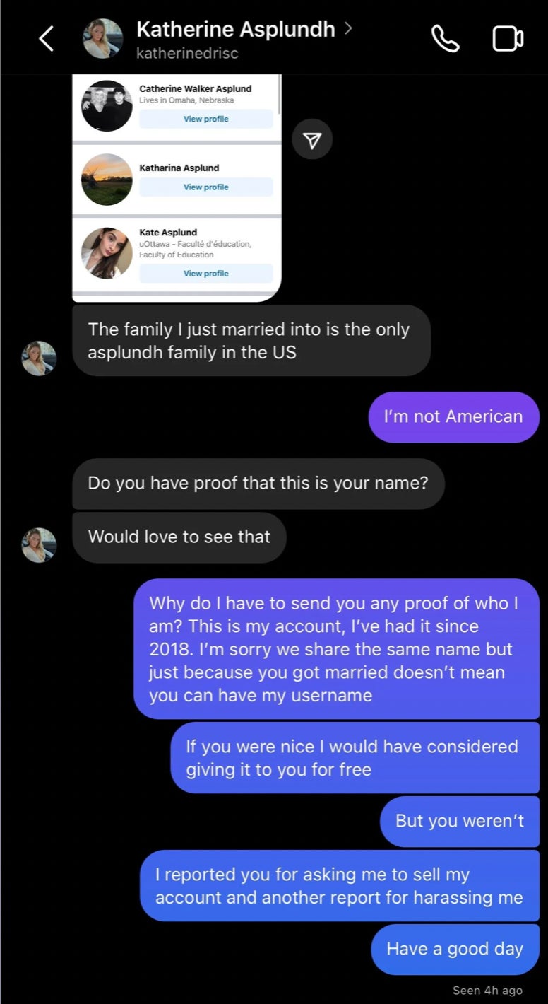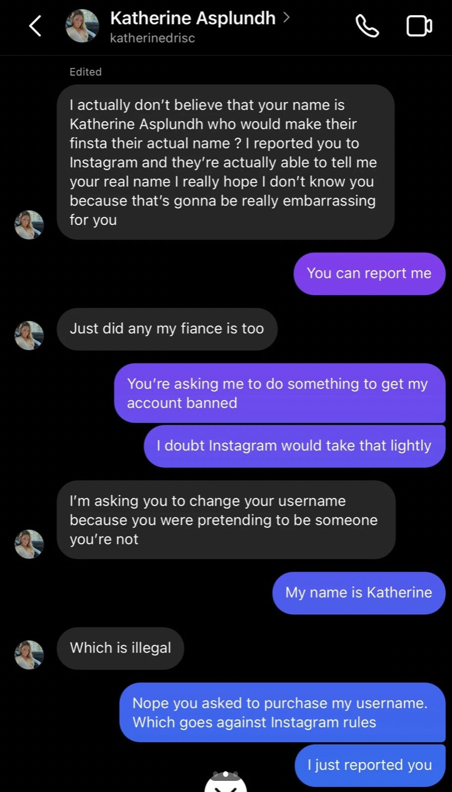 Glad the other Katherine wasn't having it despite the super weird threats to get the account taken away.