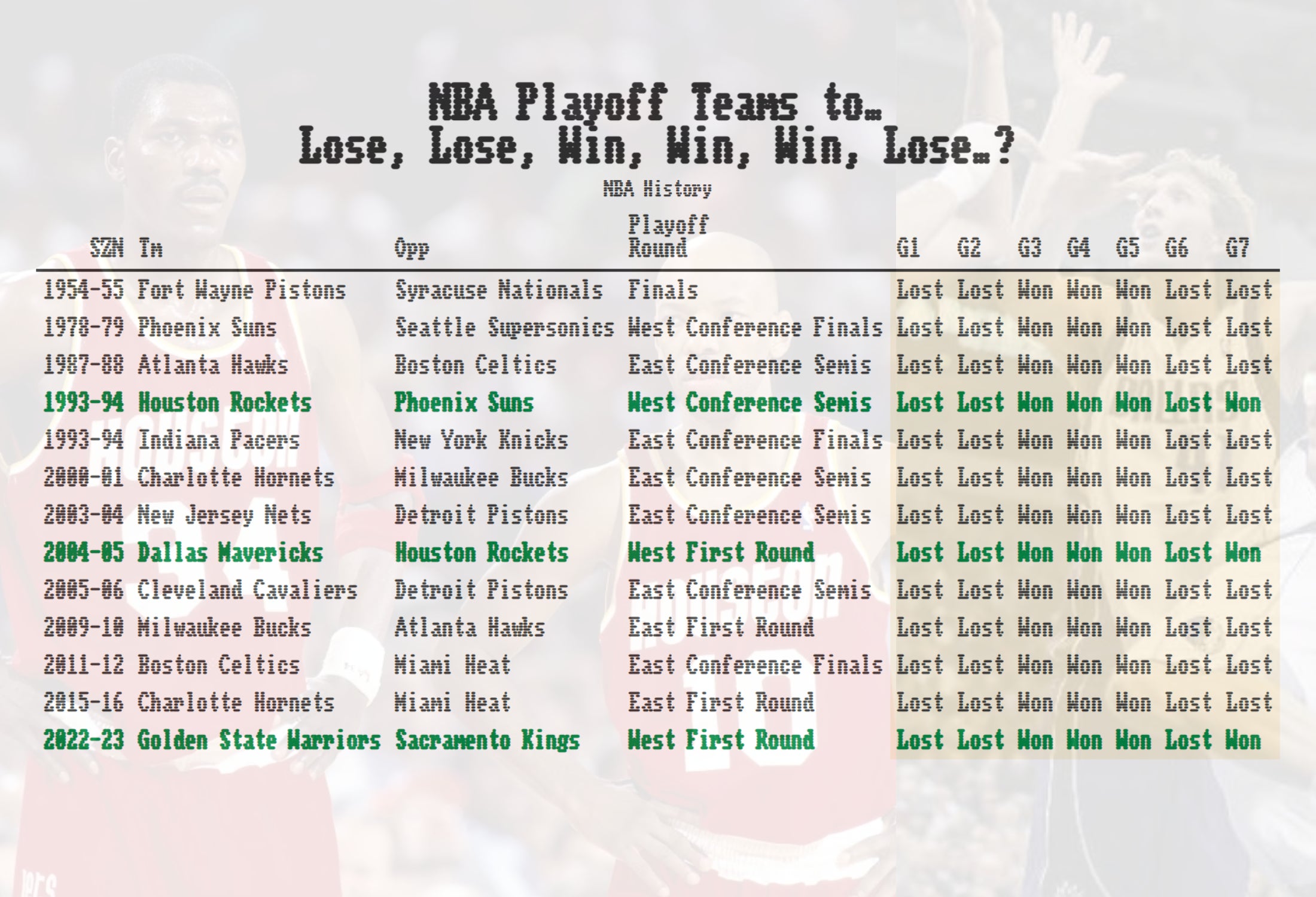 But the only two examples from this list that match the Nuggets result/location path through six games are the 1993-94 Rockets and 2004-05 Mavericks - both Game 7 winners.