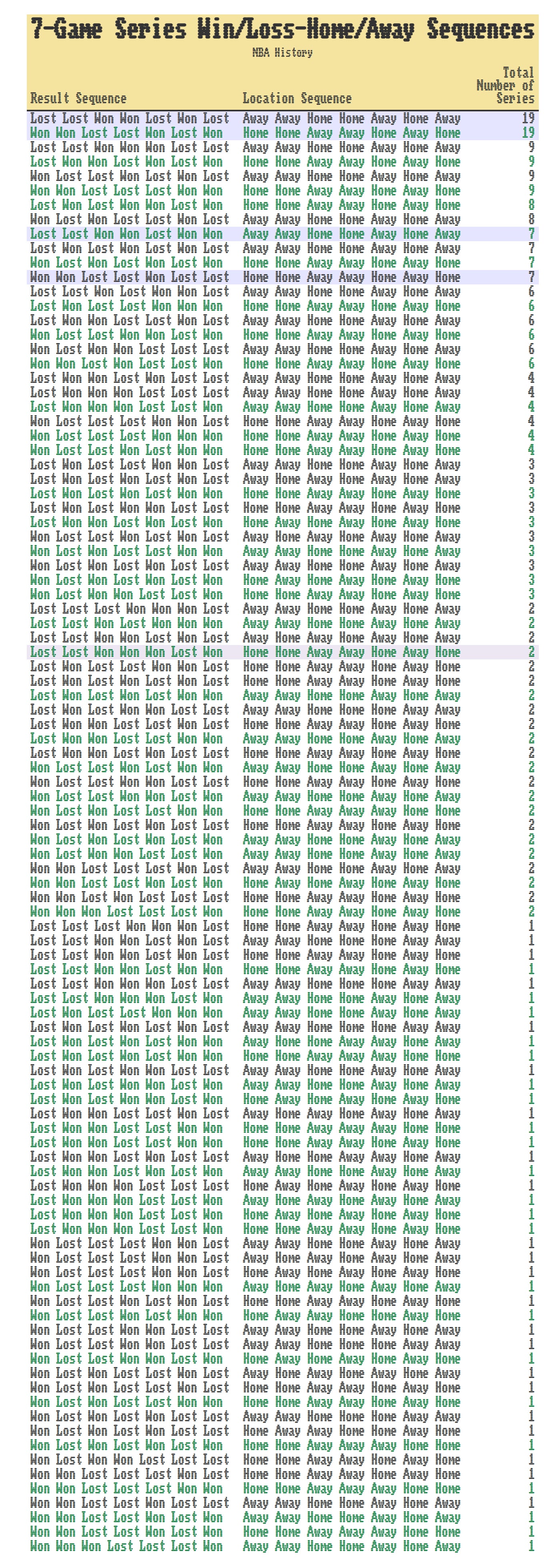 Side note - It is kind of funny to see the most common sequence by a mile is to have the favored home team win all the home games and lose all the road games. You've heard a series doesn't start until a team wins on the road - but I guess it sure as hell can end.