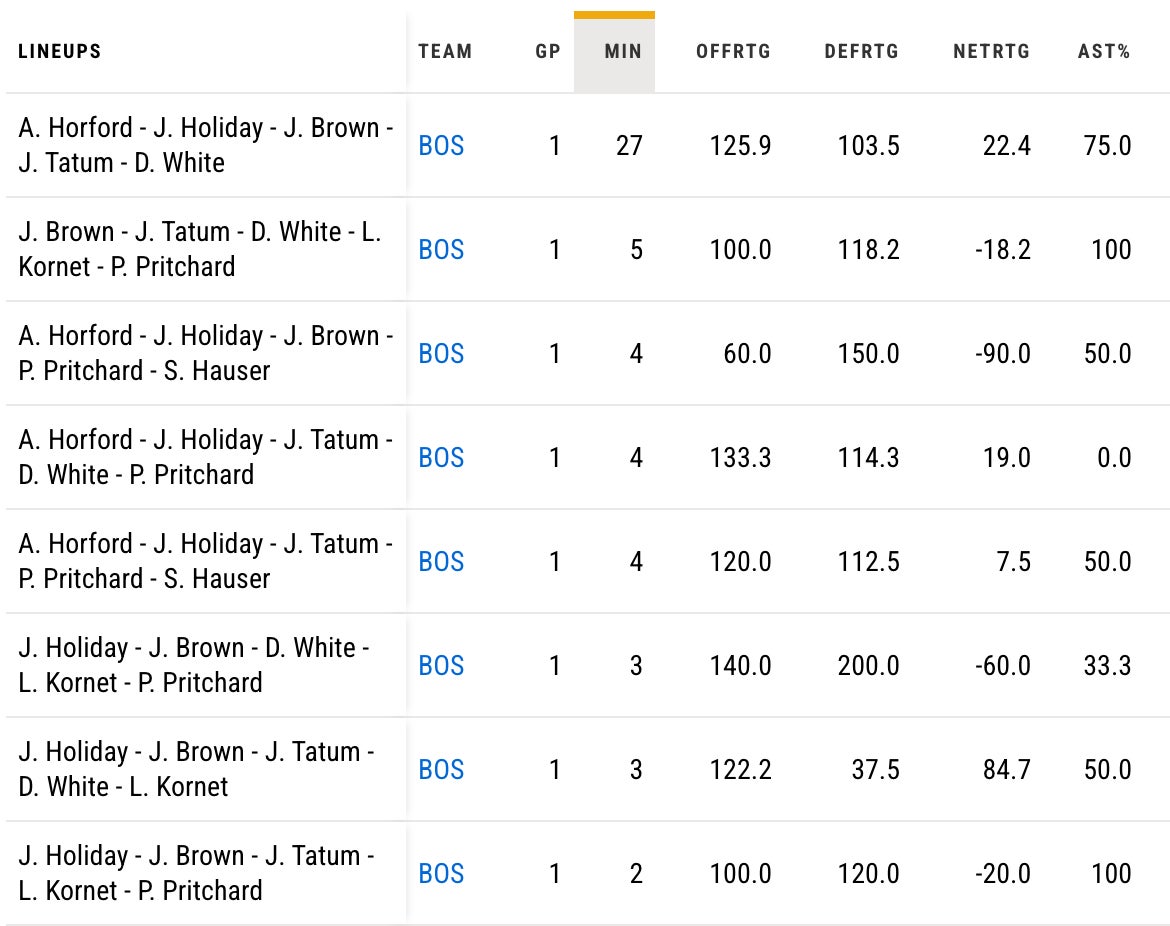 When your main 3 bench players are all mostly unplayable, it's extremely lucky to still win a playoff game. It's no surprise that the two worst lineups last night were the non-Tatum lineups, and that's something that has to be figured out. This team cannot play Al Horford 40 minutes every game, so Joe has decisions to make. If Tillman is back, maybe it's him. Maybe it's Brissett time for the energy. Maybe it's Tatum at the 5, but that's a problem if Hauser and Pritchard are going to be unplayable.