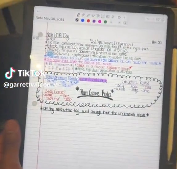 I mean look at that. I've seen some people throw the term "zesty" out there. I've seen people say that he takes notes like a nursing major. Say what you want about Malachi Corley, but the man has cracked the code. The colors, the curvature of the font, the highlights. He figured it out. Even down to the squiggly little cloud thing. You shouldn't be allowed to have handwriting that nice AND be able to rep out 225 27 times.