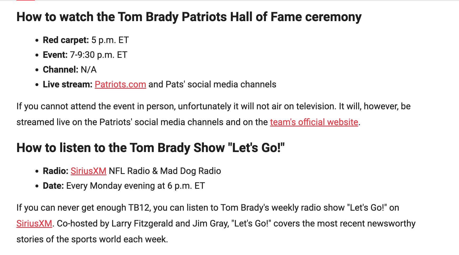 The seven-time Super Bowl champion, five-time Super Bowl MVP and three-time league MVP will now get to call himself a Patriots Hall of Famer. He will be inducted by Robert Kraft and the Pats franchise on Wednesday night, with red-carpet entrances starting at 5 p.m. and the ceremony beginning at 7 p.m.