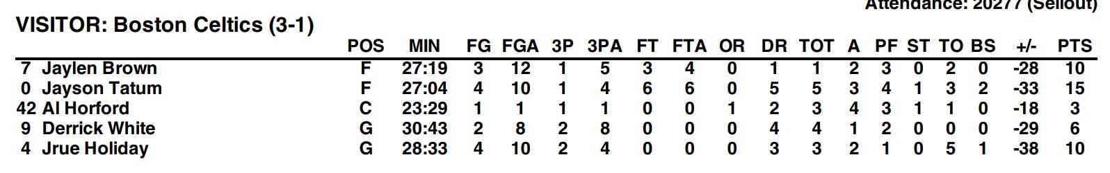 Remember, this also comes with zero defensive stops on the other end. Tatum got off to a good start in the first quarter, but was pretty much a non-factor the rest of the way. The backcourt couldn't make shit, whether that was open 3PA or plays in the paint.