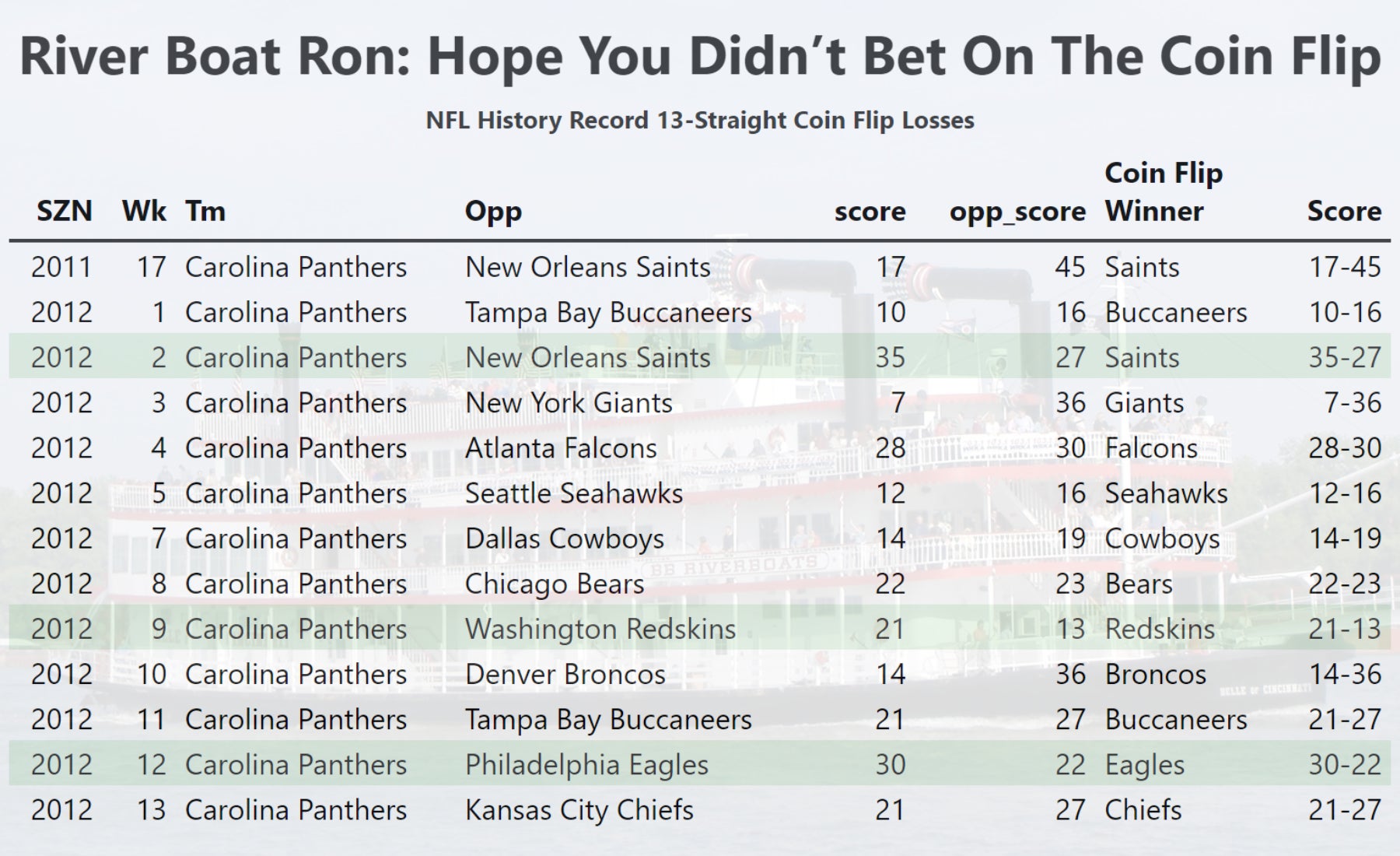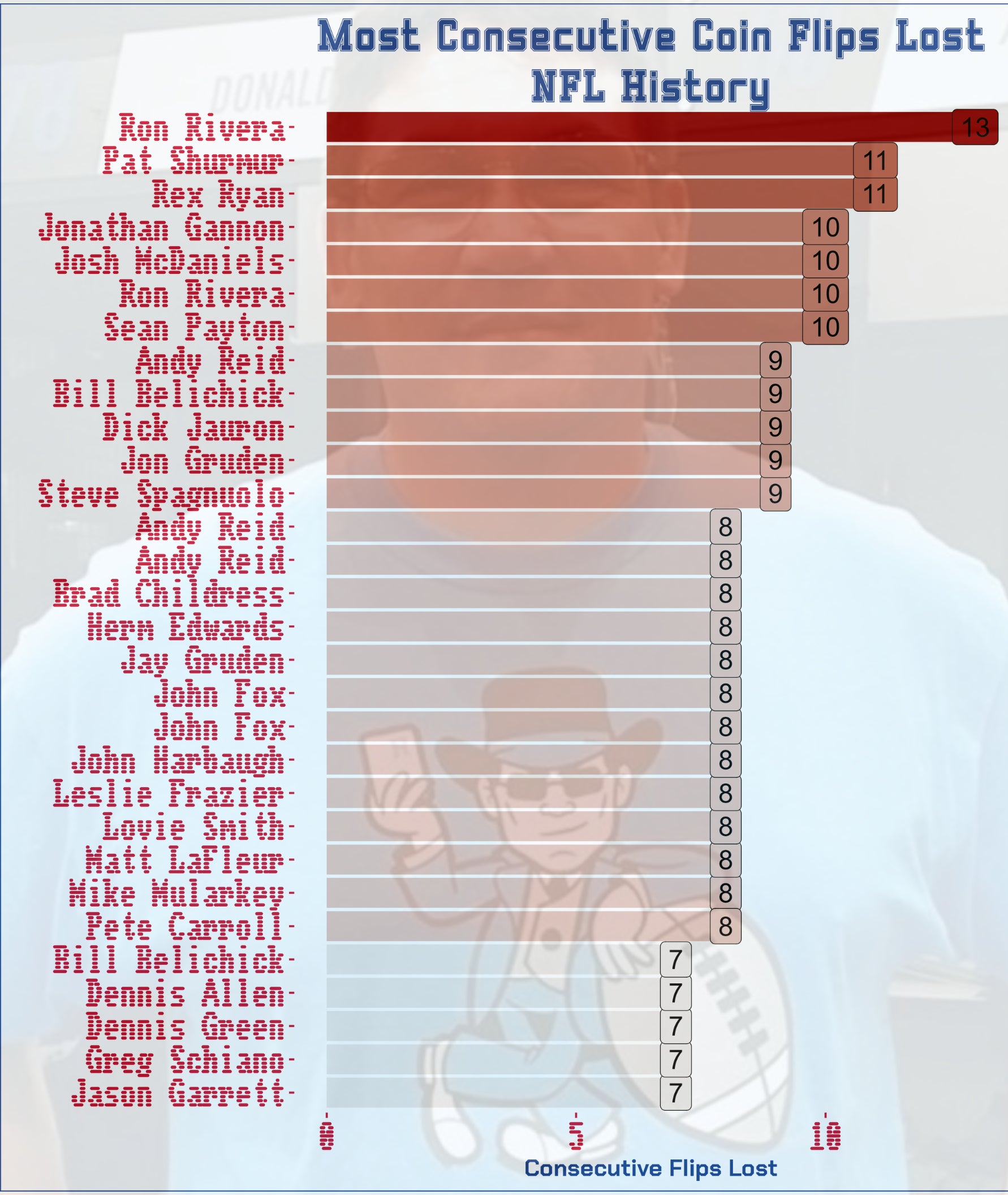 On the flip side of that coin, we have Riverboat Ron Rivera who lost the most consecutive coin flips according to the record books. There is no need to also mention he had a separate streak of 10 coin flip losses in a row too.