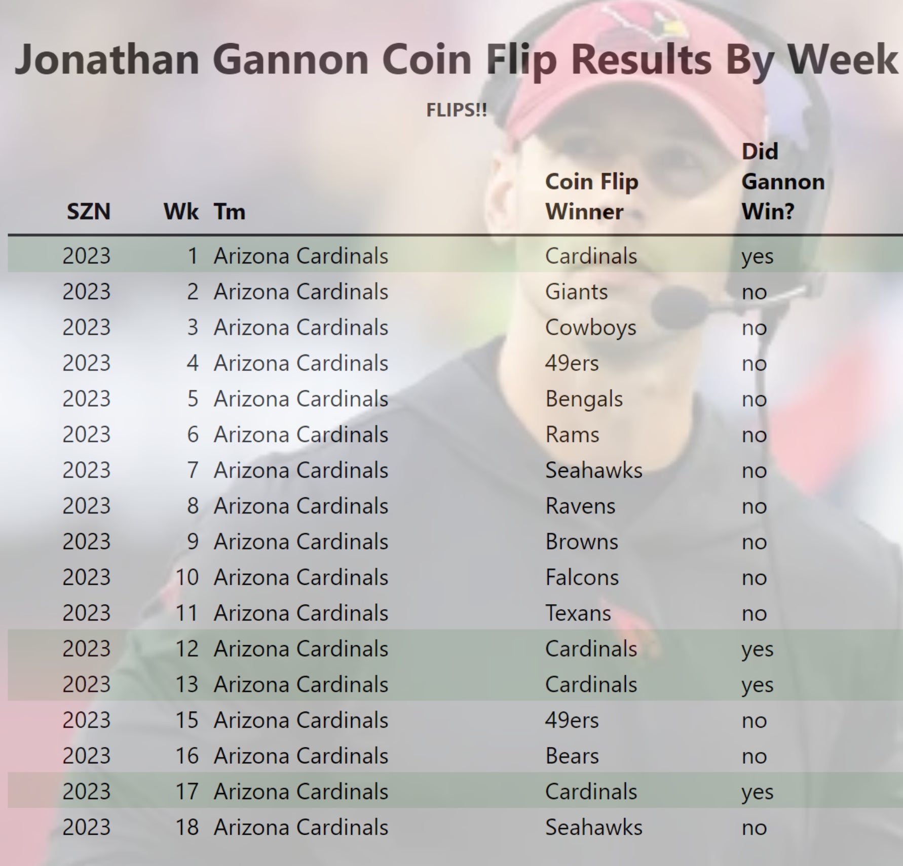 Wait a minute…That's not true. Gannon managed to win the toss in Week 1 before losing ten straight right afterwards. Wonder who the Cardinals played in Week 1? What coach could have been so ill-equiped at coin flip voodoo to let this happen?