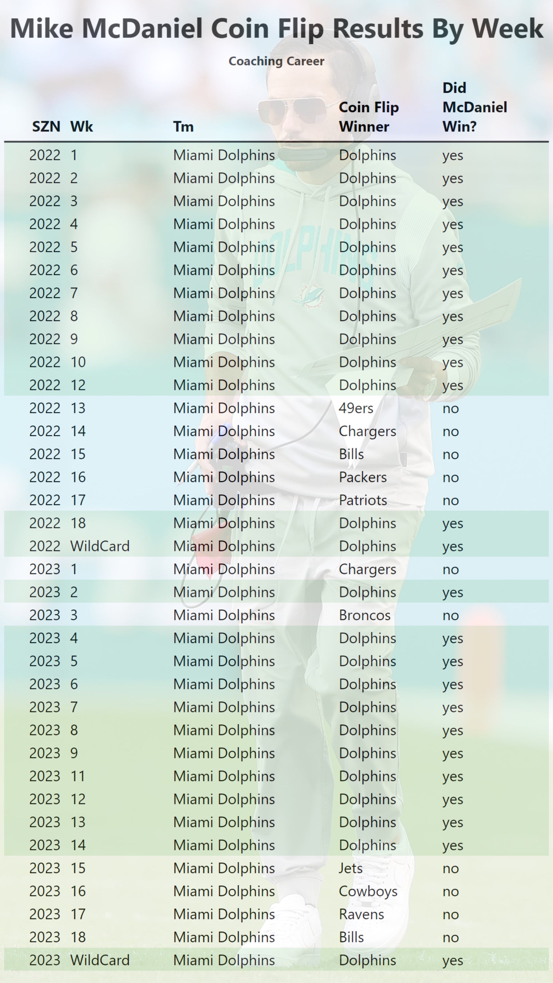 That's right. Not only does he have an 11-game streak, but another 10-gamer in just two seasons as an NFL coach. If it ever comes out that McDaniel was guilty of some coin gate scheme please remember to credit me first. The forensic statistics smell something here and that something stinks. Who's to say he isn't sneaking a weighted coin in via one of his team captains with some magician expertise? Obviously he lost his special weighted coin for five weeks in his first year and again in year two for four weeks to end the regular season. But he always had it for the playoffs. Interesting. Interesting indeed.