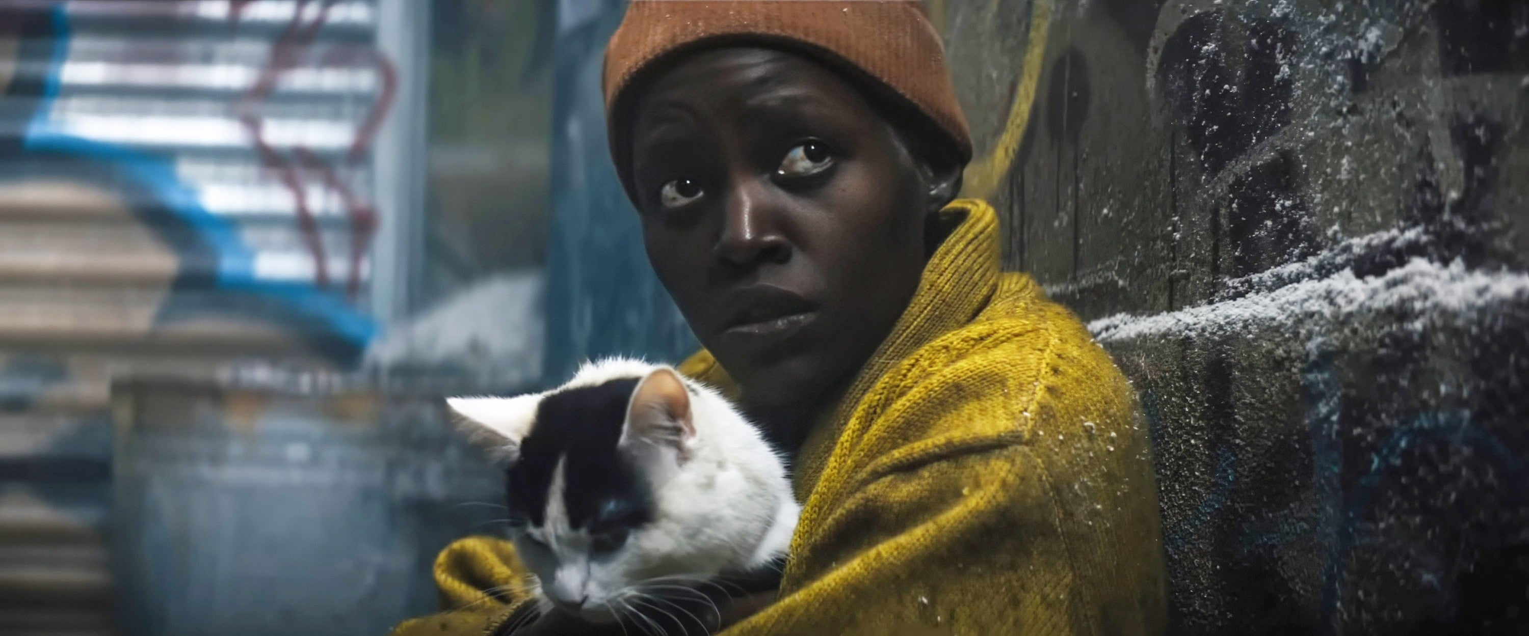 That cat in the picture above is a great example of the lazy filmmaking on display here. The cat vanishes for entire scenes yet always finds it way back to Nyong'o. Explosions and thousands of people getting killed mean nothing to this cat. It even goes underwater at one point and has the swimming calm of Michael Phelps. The movie has no real stakes so it uses the cat as a way for the audience to give a shit about anything going on. It doesn't work.
