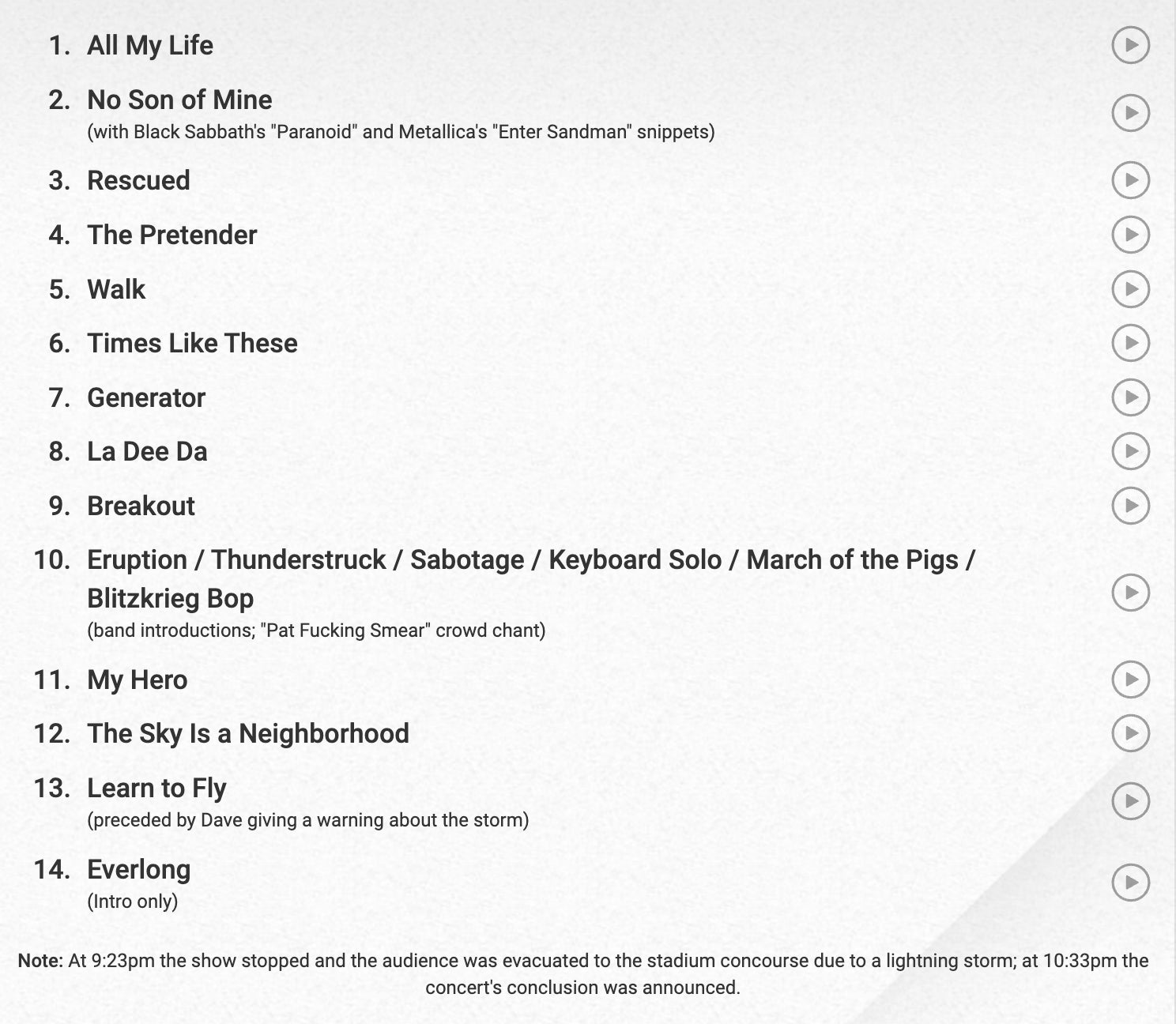-We missed out on songs like Best Of You, Monkey Wrench, and Everlong - but got All My Life, The Pretender, Times Like These, My Hero, Learn To Fly, etc. It was a great mix of new/old/greatest hits.