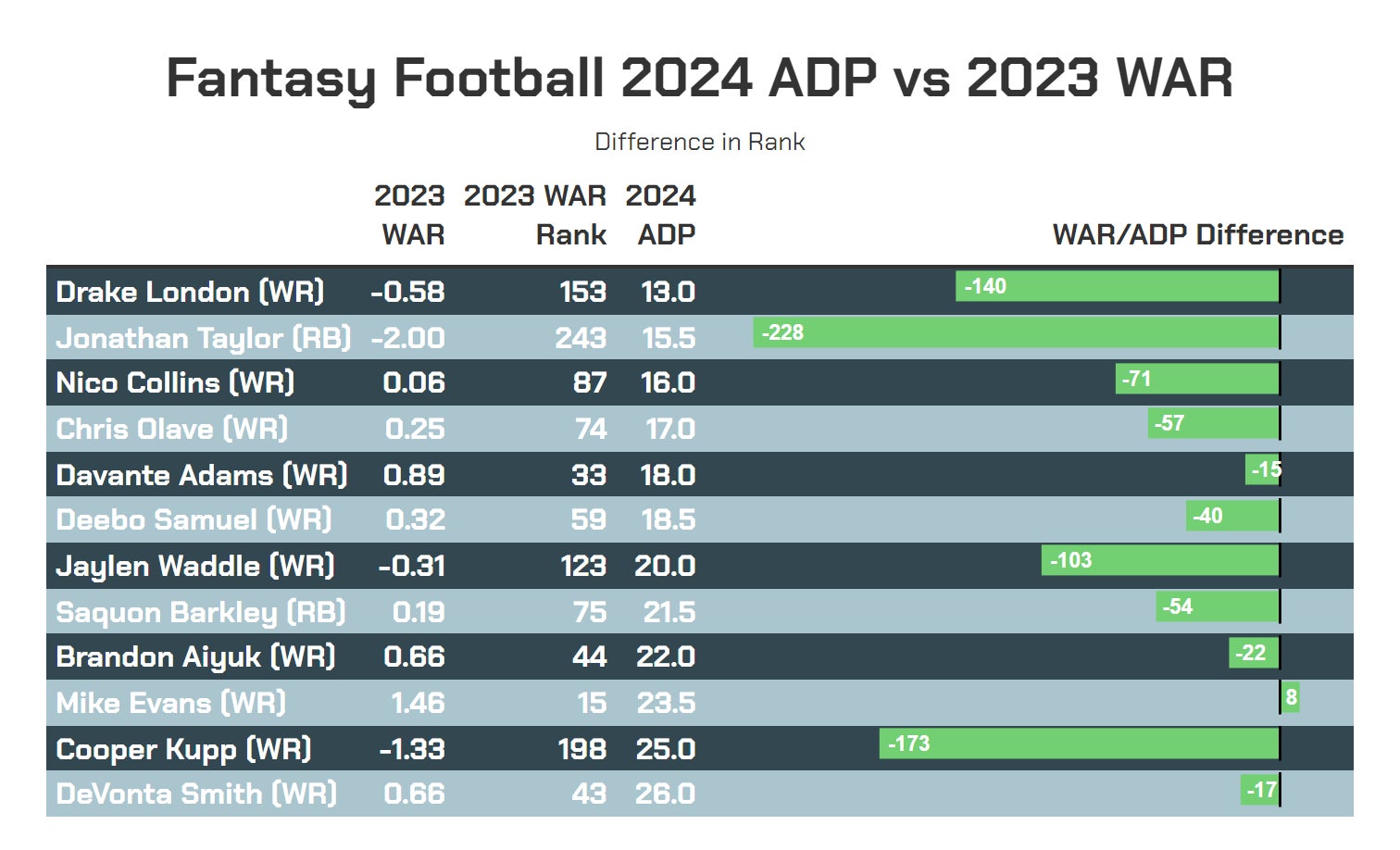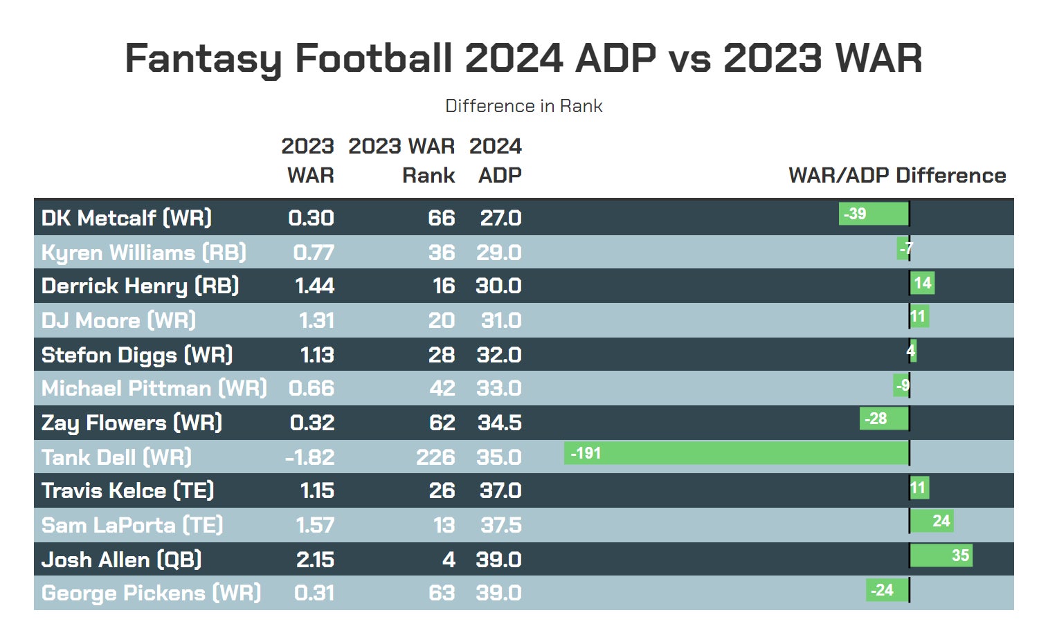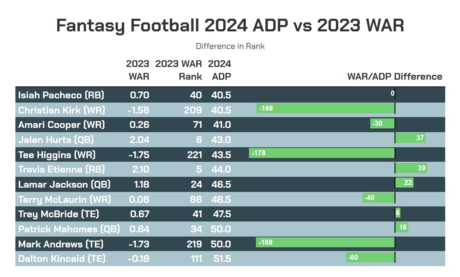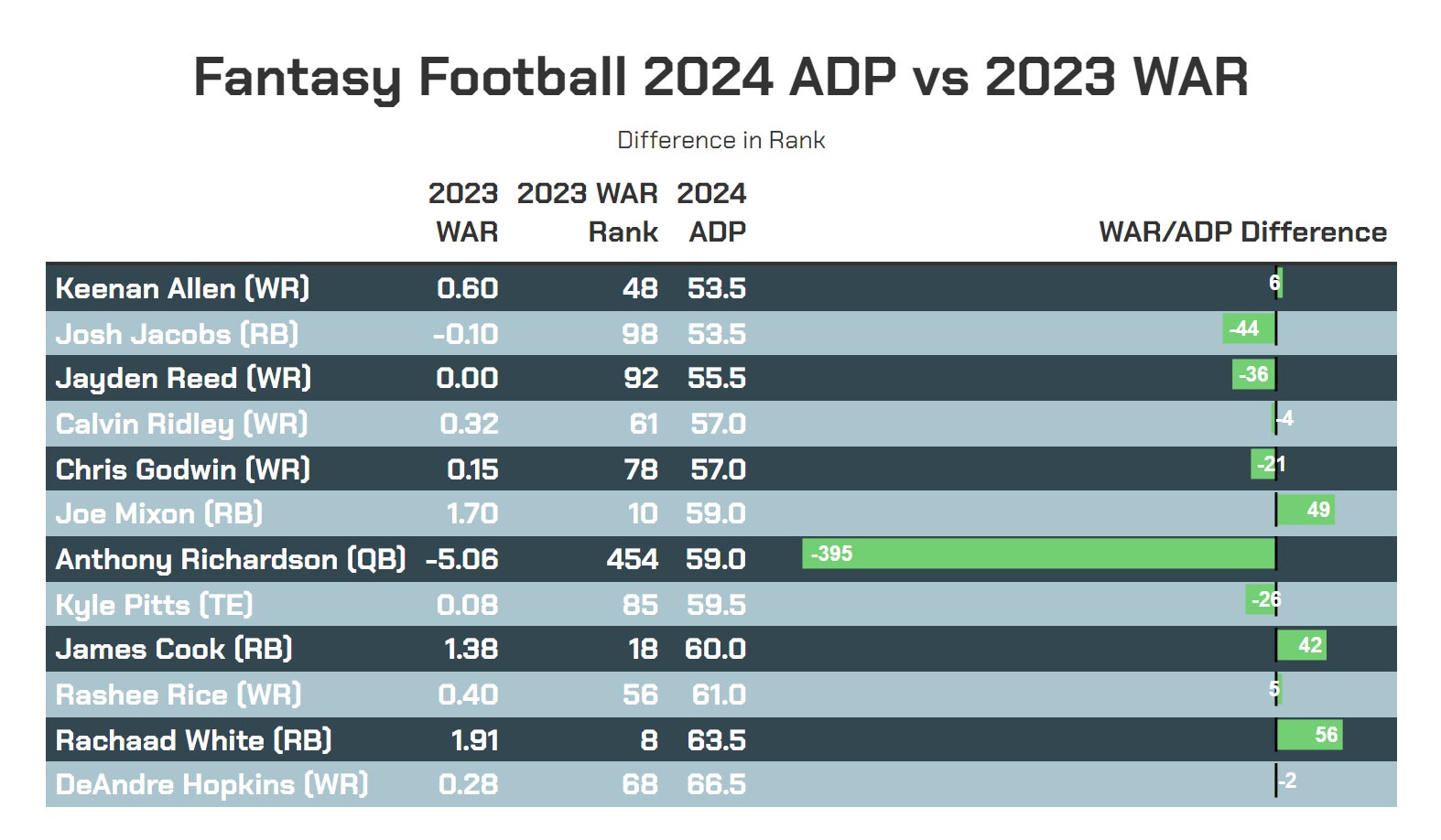 Today we're going to run a quick check to compare each player in the top-60 of PPR ADP vs their 2023 end of season WAR rank to help prepare for draft day. Obviously, things change for many players year to year, so this isn't some end-all-be-all thing, but it's a starting point.