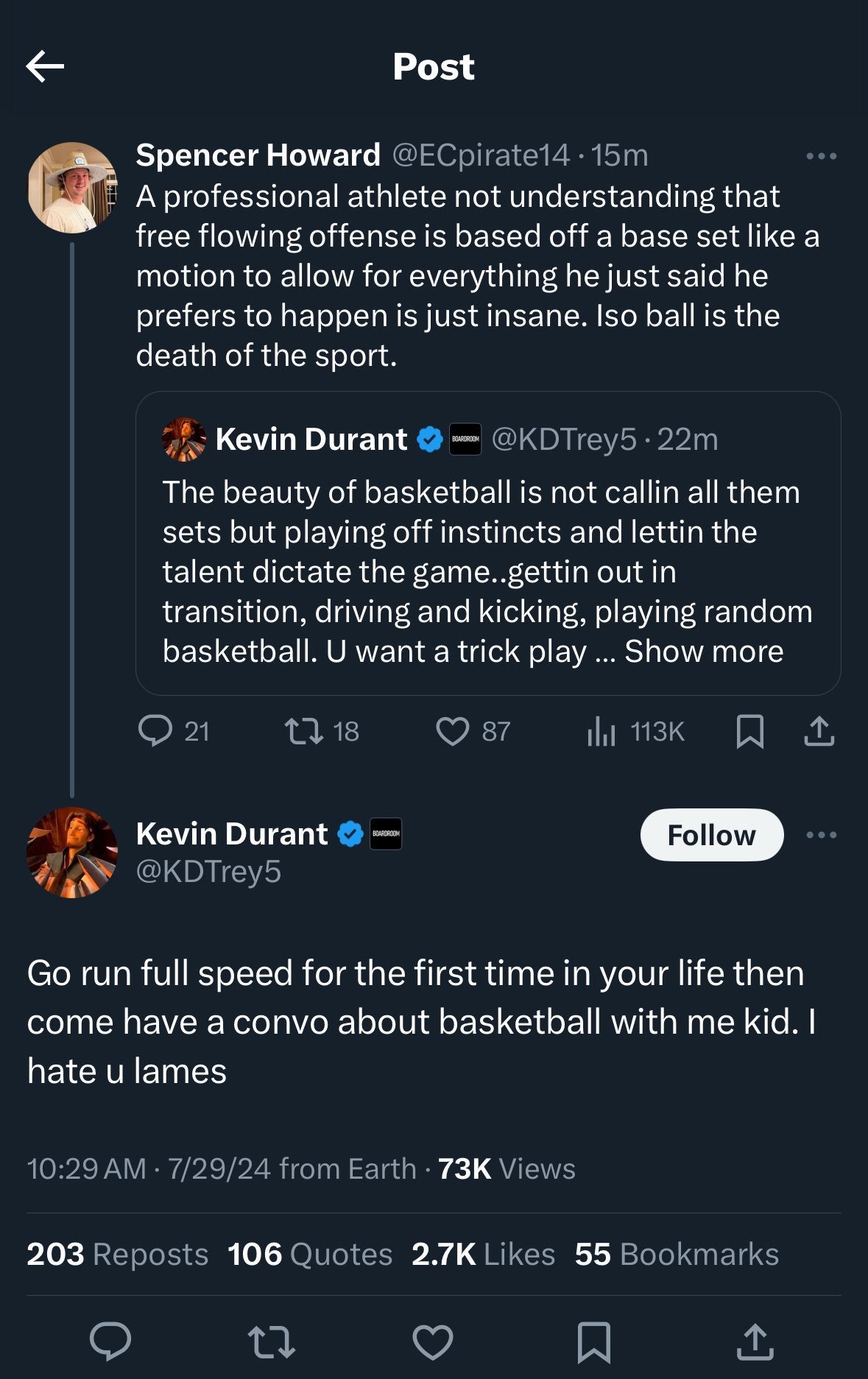 Alright, here's where things start to go off the rails. I'm of the belief when it comes to playing basketball and different styles, a player like Kevin Durant has a Ph.D on the subject. Will that stop randoms on the internet? Of course not