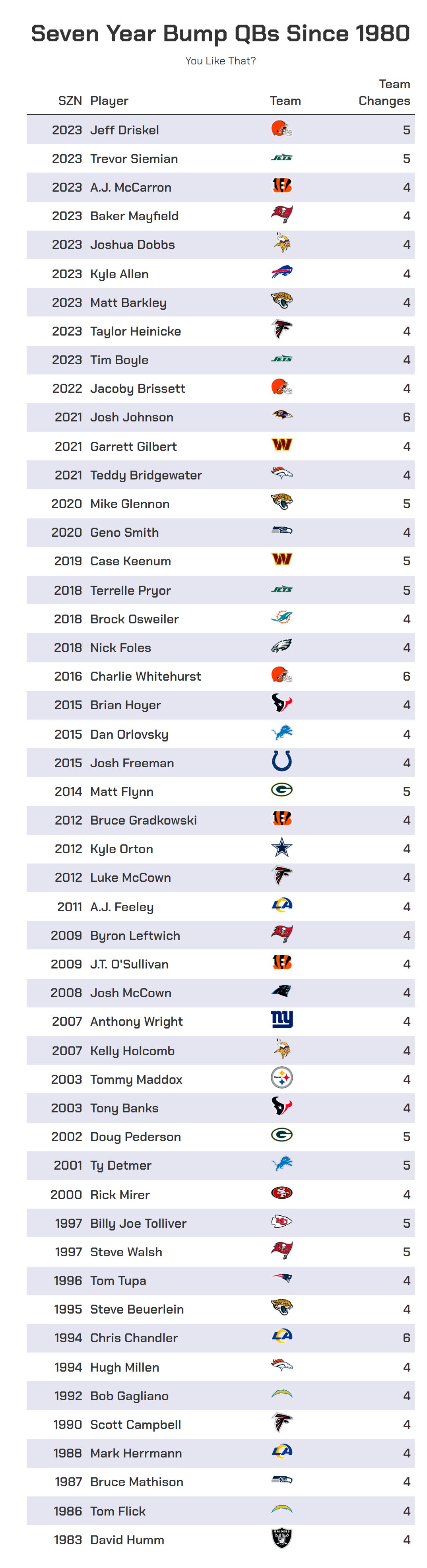 I know Sam Darnold was pegged to start the season anyway, but I have to believe every fan was hoping to see that tune change after some preseason games. Now that dream is dead and it's time to accept reality. Sam Darnold is your starting quarterback. A seventh year player who's now on his fourth team. But is it really that bad? I ran some numbers to see what precedence there is for any quarterback to play for four teams in seven years since 1980.