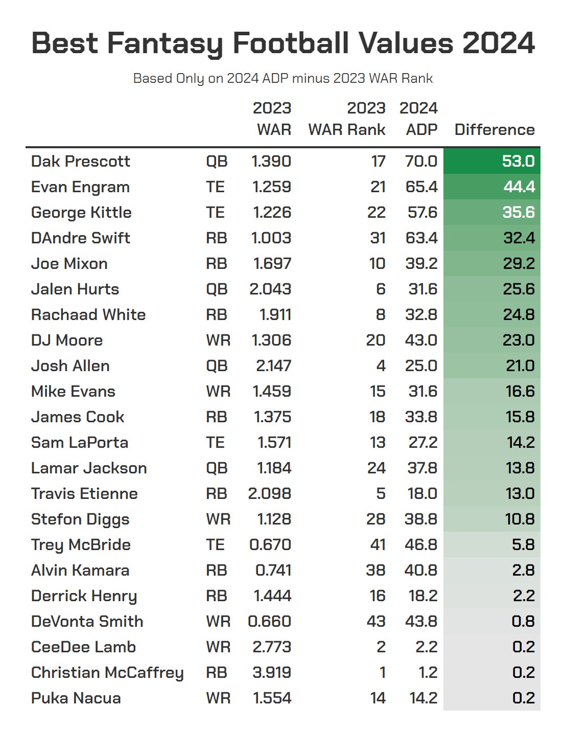 Best Fantasy Football Draft Values Based On 2024 ADP Vs 2023 Wins Above Replacement (WAR)