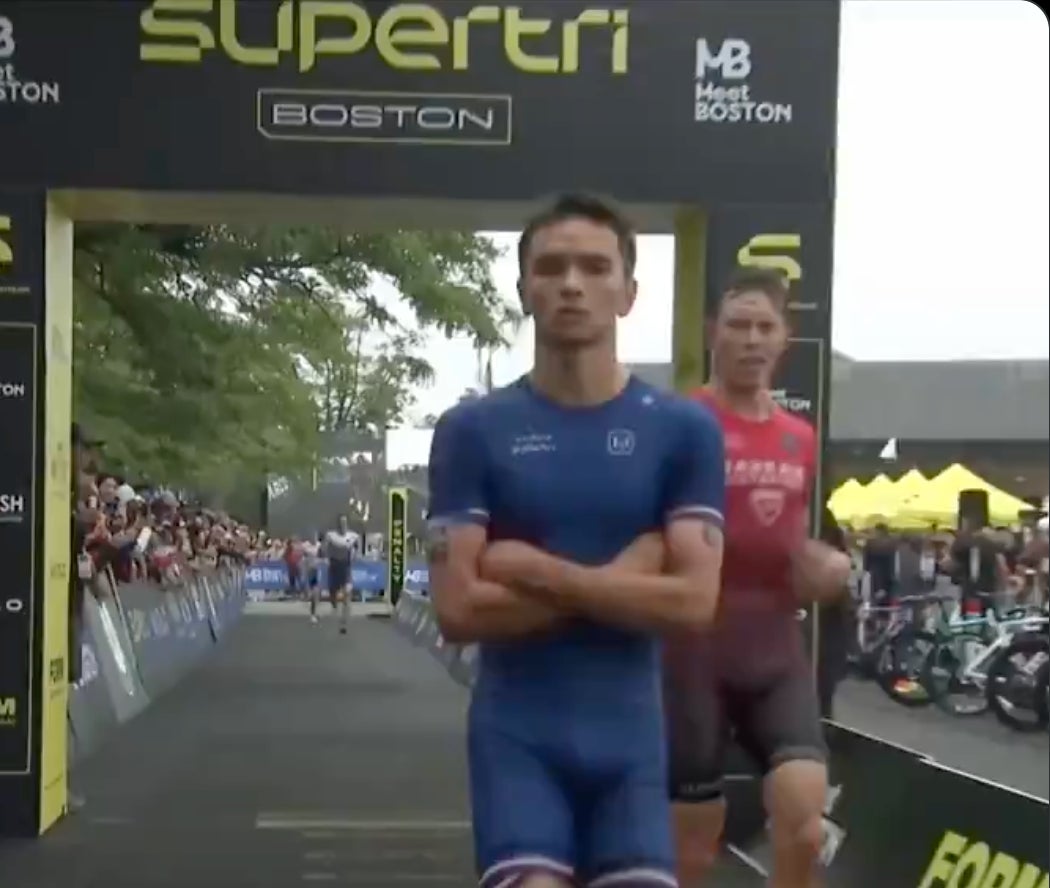 Fast forward a couple of weeks and now they're competing again in this SuperTri league. Once again, Hayden Wilde is in the lead and probably feels like he's about to avenge his 2nd place finish at the Olympics. And then…out of nowhere at the very last turn…