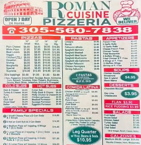 The popular pizza spot in Miami Springs is called Roman's Pizzeria (real flyer pictured below).