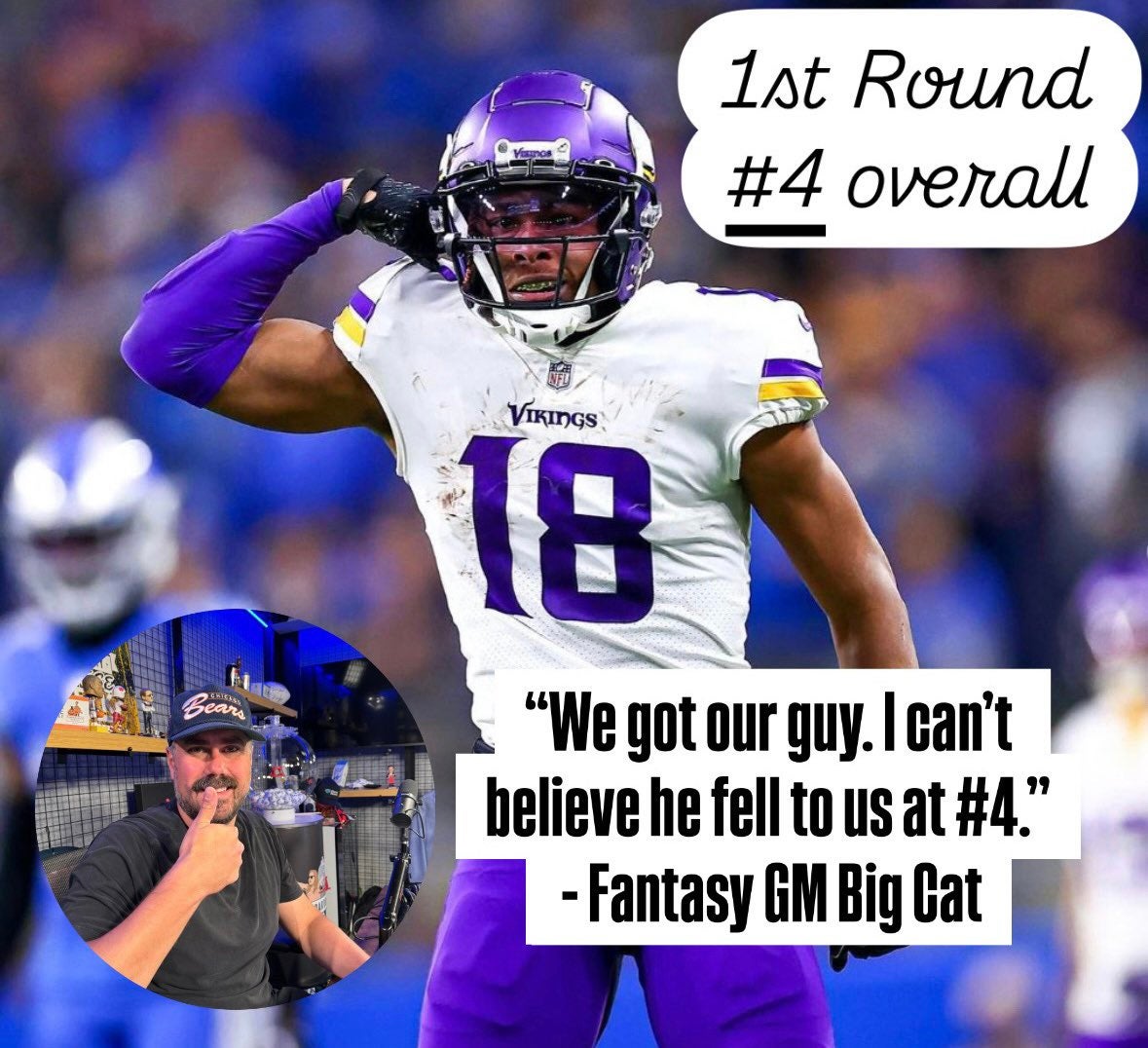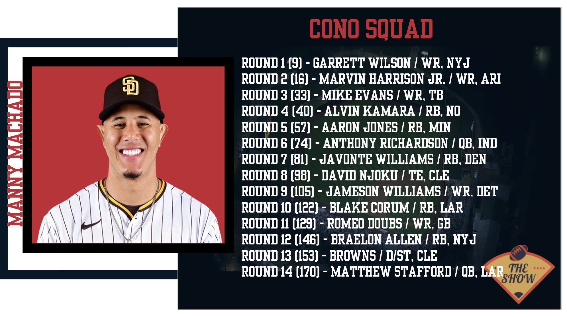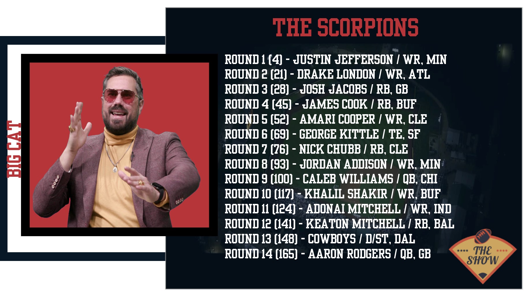 Although I would've liked to see him go a little later, but based on his health looking ok, I think it was fine at Round 8. As I mentioned, I've been hearing good thing about a Nick Chubb return in Week 5. Fellow Brown Amari Cooper is always overlooked and I have him as my WR13! Getting him at #52 overall is a great pick. But I absolutely detested the Josh Jacobs pick in Round 3, Caleb Williams as an all-in fantasy QB1 is risky. I liked Jordan Love and Jared Goff much more for 6-point passing TDs and they were both on the board with that pick. Aaron Rodgers is a good pick in the last round to kind of buoy that position. Keaton Mitchell is a good player to stash, but I am lower on Adonai Mitchell and Khalil Shakir for this year. As for his early picks, I know that group really wanted CeeDee Lamb. I like Justin Jefferson, but I probably woud've gone Breece Hall in that spot. If Ja'Marr Chase's contract situation was a bit more clear I would've went him too, but in fairness, it was not. So JJ not a bad option.
