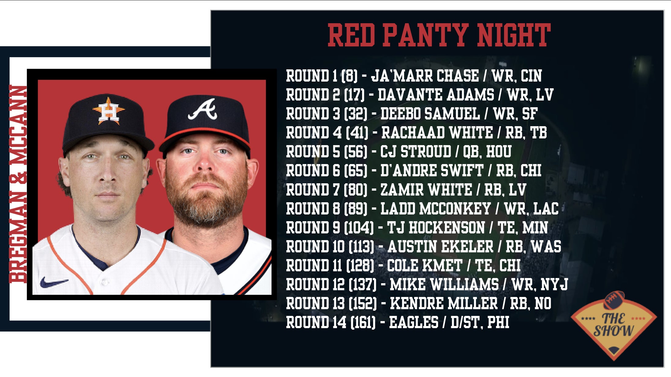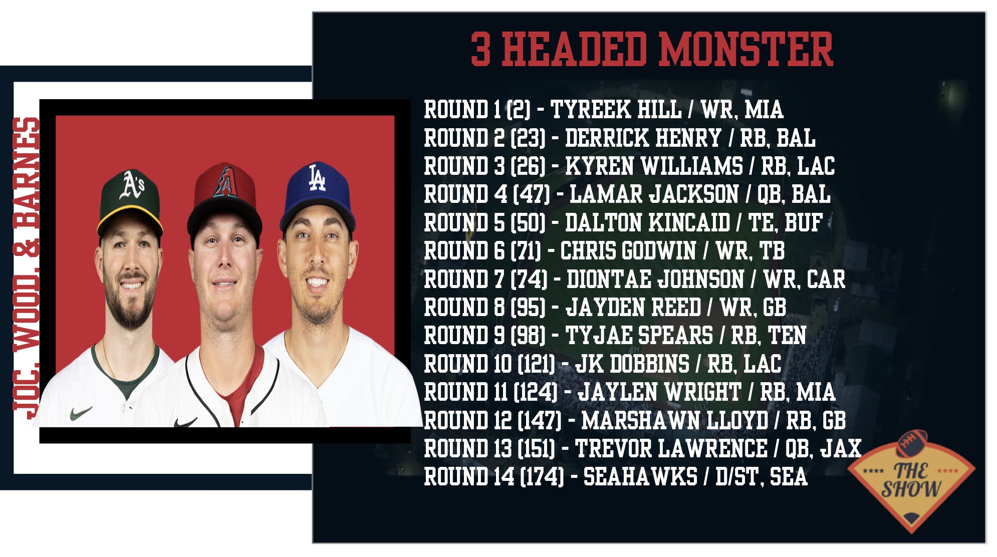 We had the fantasy football draft featuring some heavy hitting big leaguers on Tuesday. Dave Portnoy was done with fantasy to focus on chasing his million dollar futures and Big Cat was up as his replacement. Here are my grades and best/worst picks from each team, going in draft order: