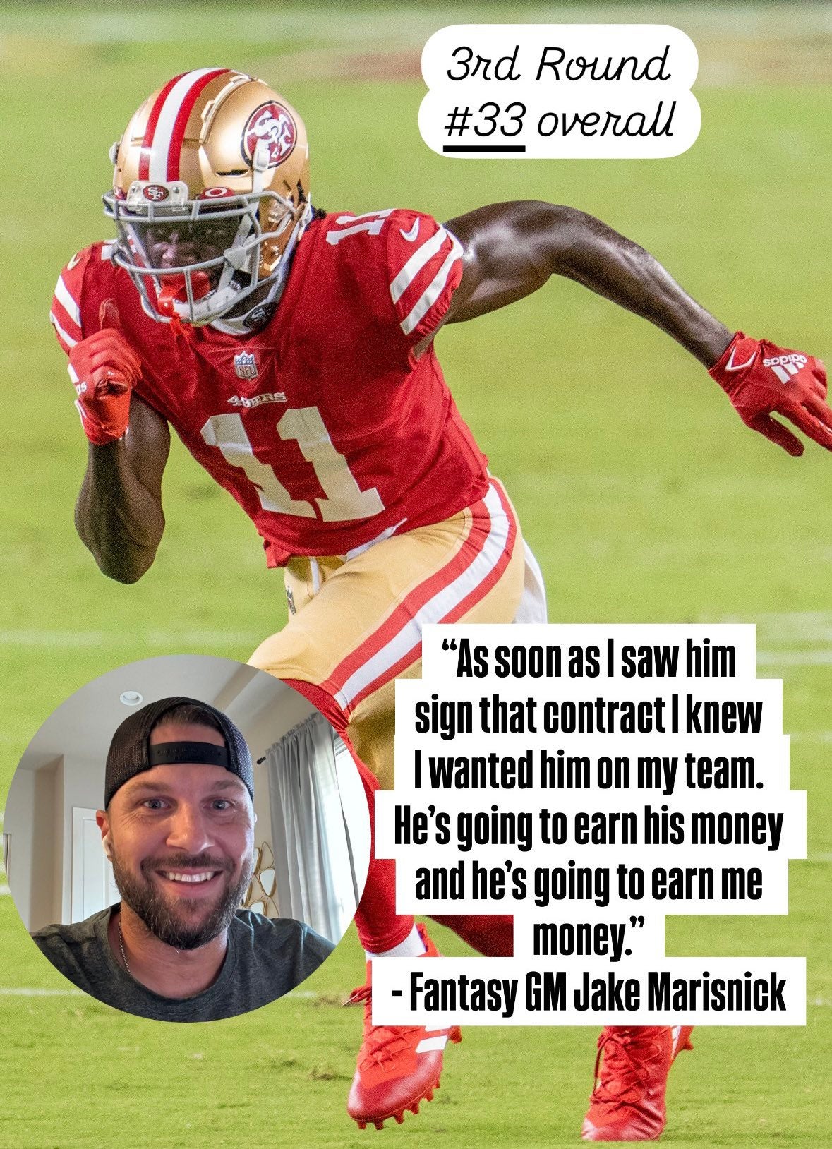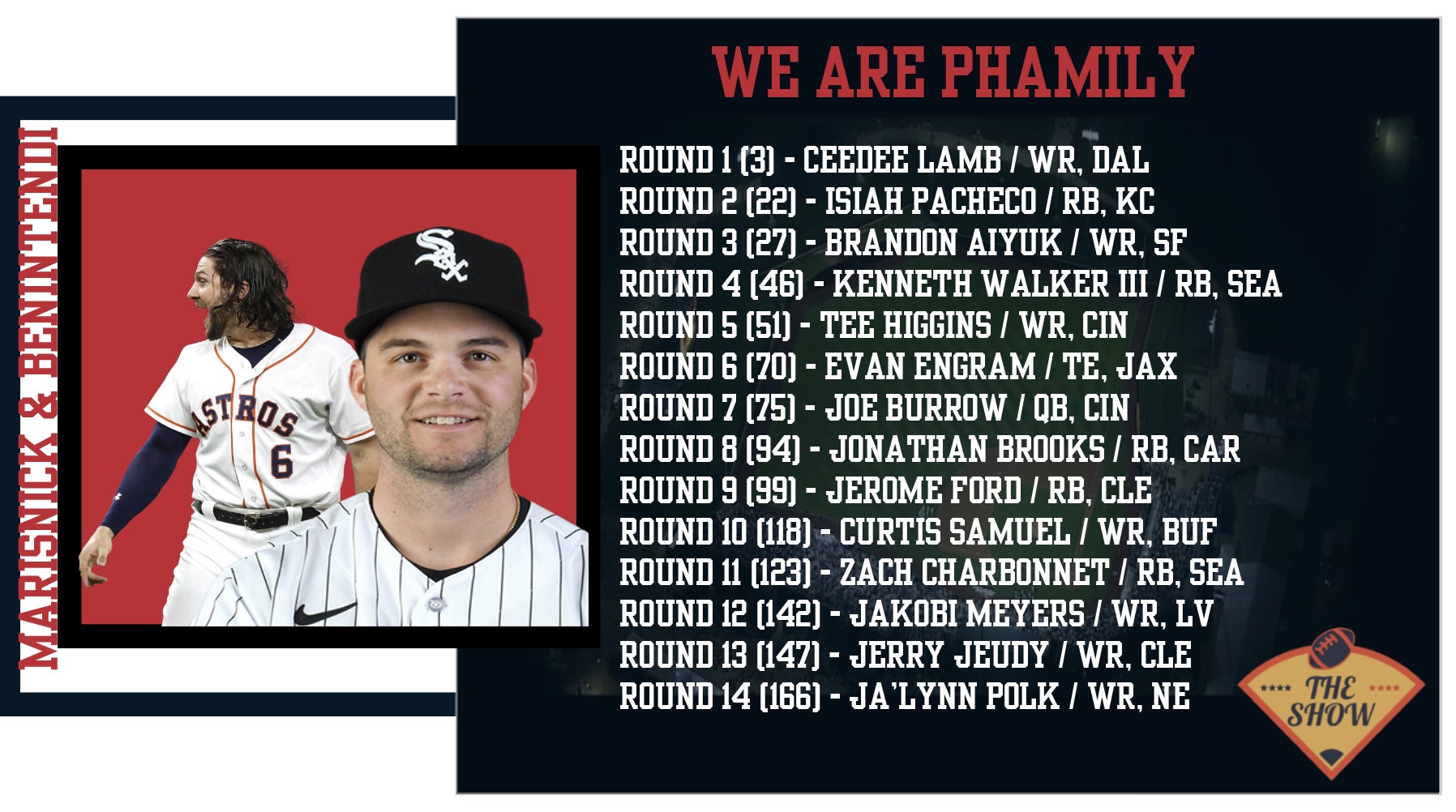 The reigning champs pulled the 3rd overall pick and they were ecstatic to get CeeDee Lamb. He's outstanding and pairing him with newly signed Brandon Aiyuk to go with Tee Higgins in the FLEX is a nice receiving corps.