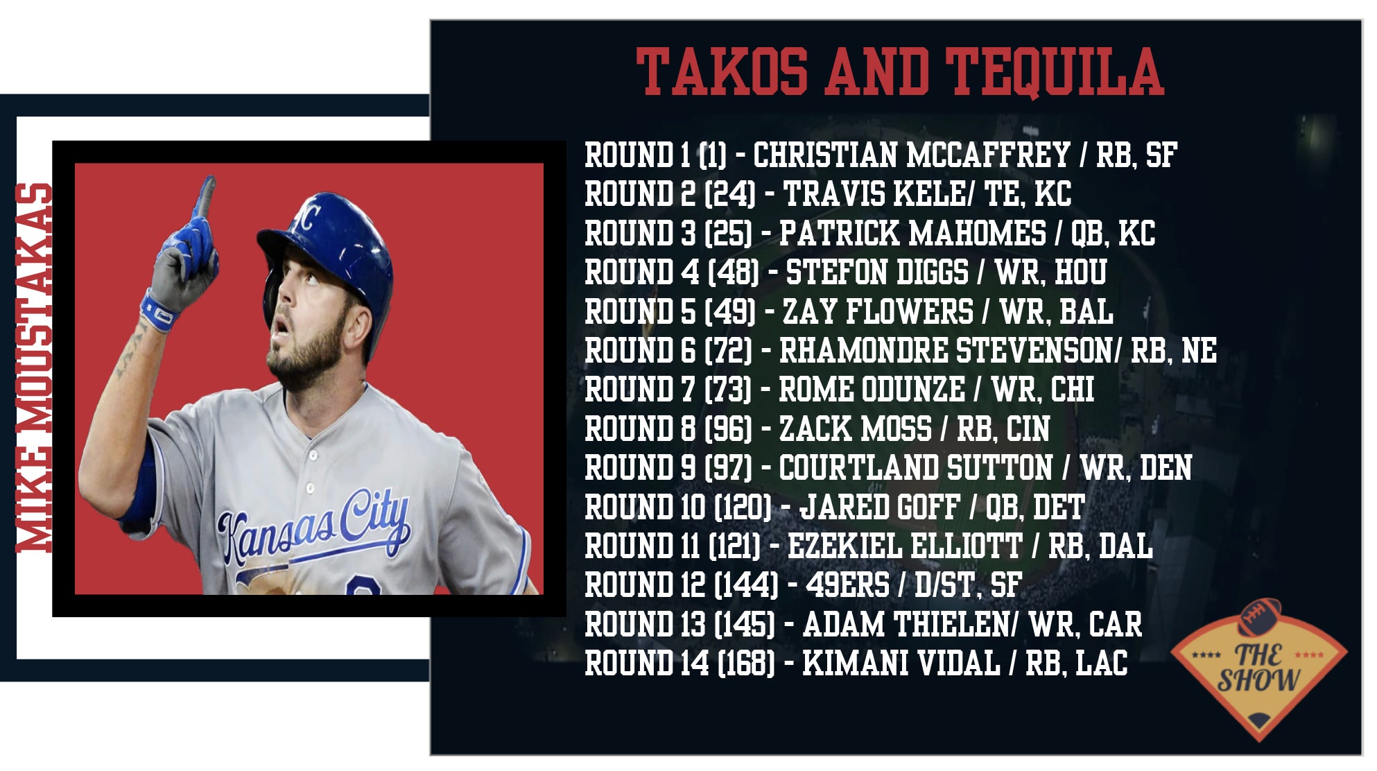 Moose had the first pick and there was no decision there. I got some complaints that I didn't give the guys a two minute warning, but I did say we were starting promptly at 10am CST, and when that clock stuck the top of the hour, Moose turned that card in within five seconds. McCaffrey is the no brainer pick, but I really like what he did in rounds 2 + 3 with the Patrick Mahomes/Travis Kelce. These two really take advantage of the scoring system with a full point per reception and 6-point passing TDs. Zay Flowers is great value in Round 5, Zack Moss has some big time upside in Round 8, Jared Goff is an excellent backup in this format in Round 10, and Kimani Vidal has the chance to be a real stud which is rare for a 14th rounder. He got a great draw with the lottery in terms of where he picked, but he hit this one out of the park.