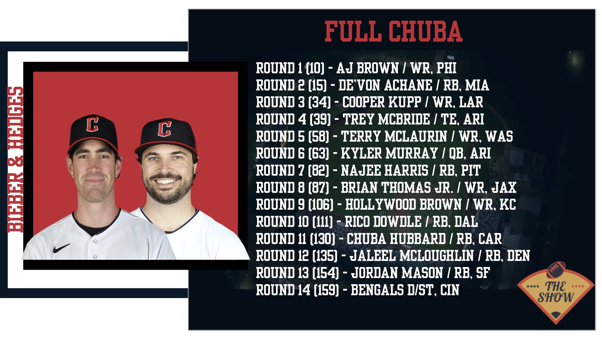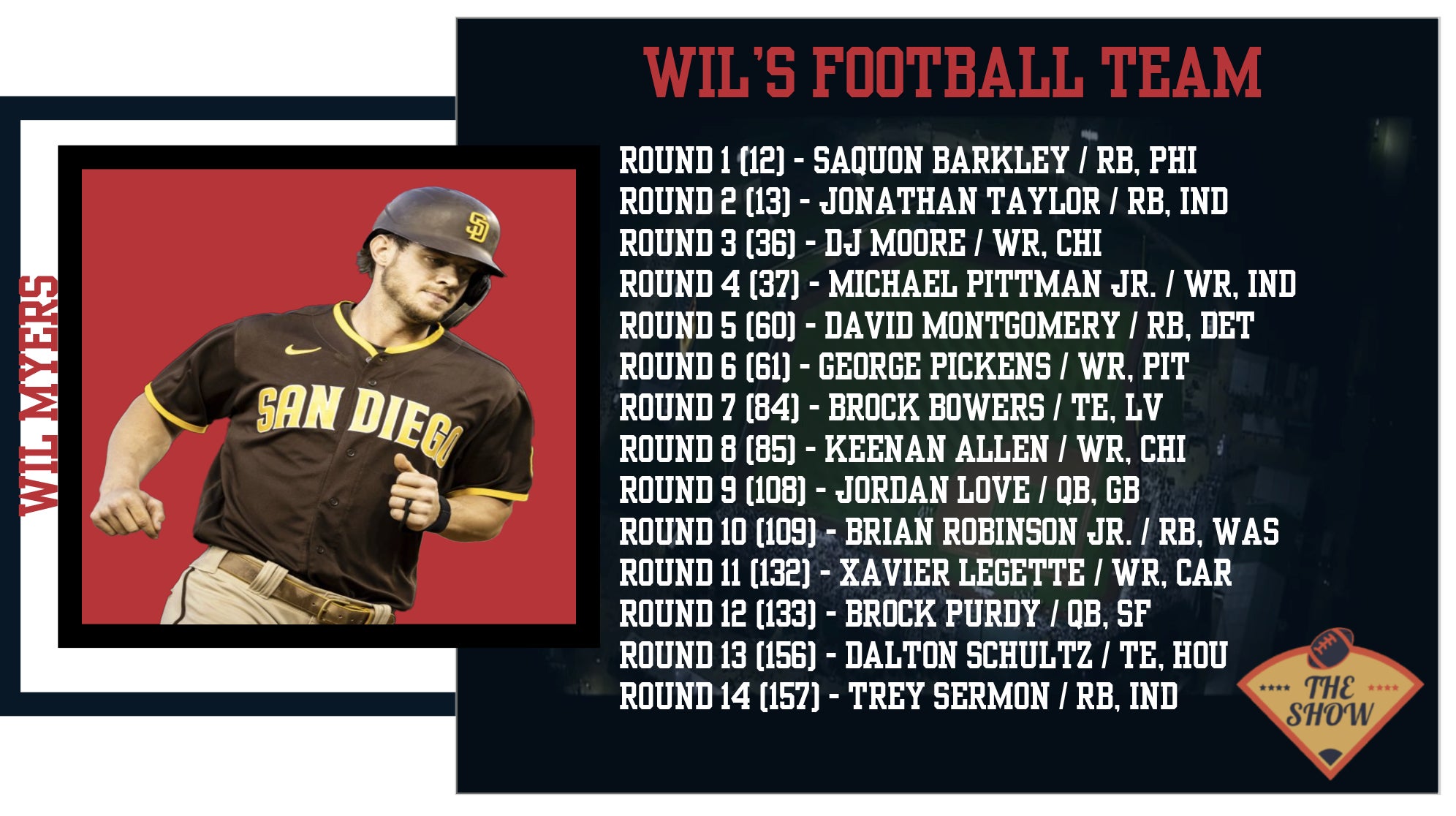 It turns even nicer when you realize he's got a stack with Joe Burrow at QB. His backfield is very formidable with Isiah Pacheco and Kenneth Walker III. Both aren't HUGE pass catchers but are good in any format. Evan Engram challenged Burrow as my favorite pick here. He's my TE2. Burrow in the 7th round with 6-point passing TDs is actual robbery. He was the 9th QB taken and this scoring format plays to his best traits. Curtis Samuel and Jerry Jeudy (UP YA BOOTY!) are both WRs in new situations that could take a step forward or could be cut from this team. But I view both as worthy risks. Jerome Ford will start the season, but I think Nick Chubb could be back sooner than most think so I wouldn't depend on him too much. This team is looking to repeat and I think it's absolutely plausible they do after this draft.