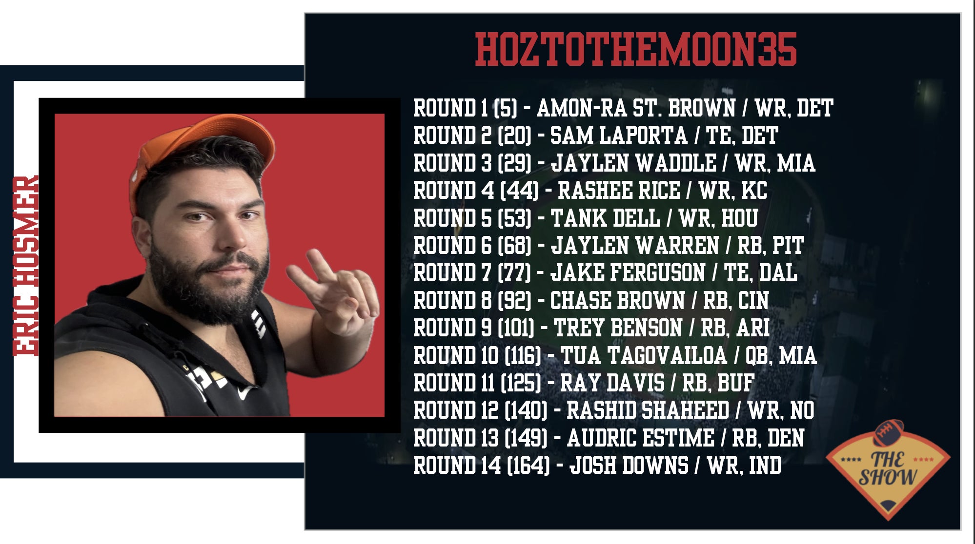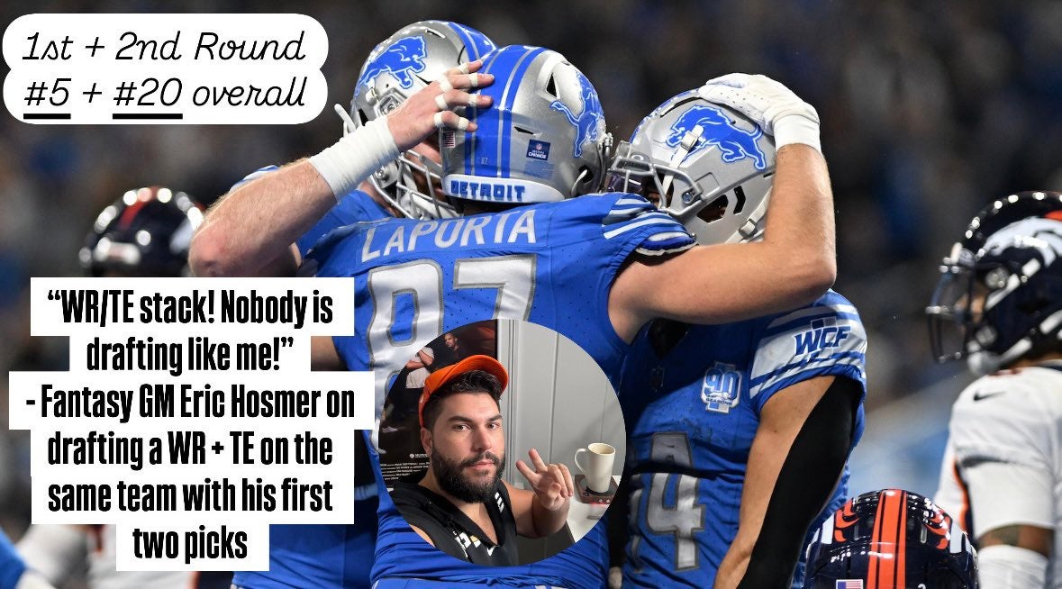 Hoz has embraced the Zero RB strategy, which makes a ton of sense in a full point PPR league, but I question how he went about it. He was bragging about his stack of Amon-Ra St. Brown and Sam LaPorta. While they're both good players, it limits the upside as they'll be competing with each other!