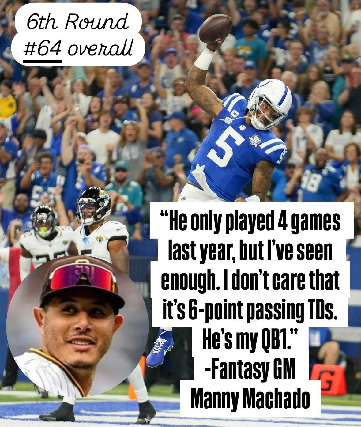 While I don't necessarily love the players for fantasy in Alvin Kamara and Aaron Jones, two legendary RBs, for this format, they play as they're both adept pass catchers. Where he starts to lose me is Anthony Richardson. Who I get has a ton of hype. But he's played 4 games really. This is a guy who has never thrown for 225+ yards and never rushed for 60+ yards. His production for fantasy was great, but it was mainly rushing TD dependent. I need to see a bigger sample size from him, but I also don't like him in 6-point passing TD as I'd rather have a safer, more established passer that'll rack up those passing TDs.