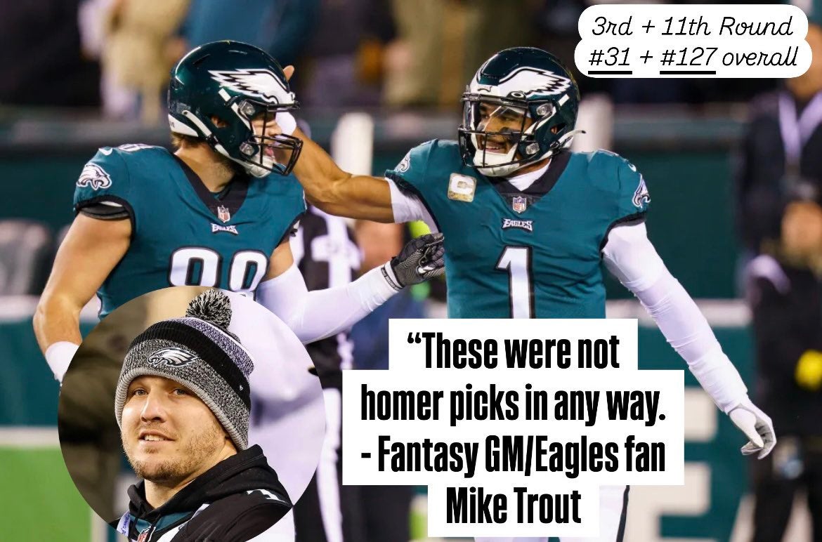 Breece Hall being available at #7 in a PPR league is a steal! This is a guy who is coming off a 76 catch season that included almost 1,600 total yards. He got in the end zone nine times last year but with Aaron Rodgers back, I can see all his numbers going up. Jalen Hurts seemed like a bit of a homer pick from the Eagles fan, Trout and I'm not sure it was the wisest move in a 6-point passing TD league.