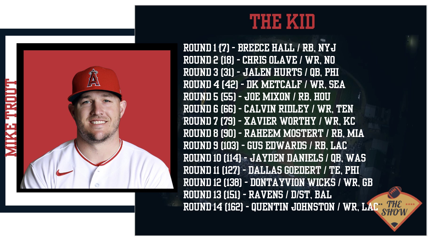 I do like the DK Metcalf pick a lot and I expect him to thrive with a new OC and while I didn't love Joe Mixon as a big time fantasy RB, getting him in Round 5 is below market value. Xavier Worthy is a flashy name, but I'm not sure how much substance he'll bring to the fantasy fields. But I do think that Gus Edwards and Raheem Mostert are good gambles given Mostert was a TD machine last year and Edwards is going to a Chargers offense that's going to run run run run. Dontayvion Wicks can do it all for Green Bay and Quentin Johnston is a worthy flier in the final round.