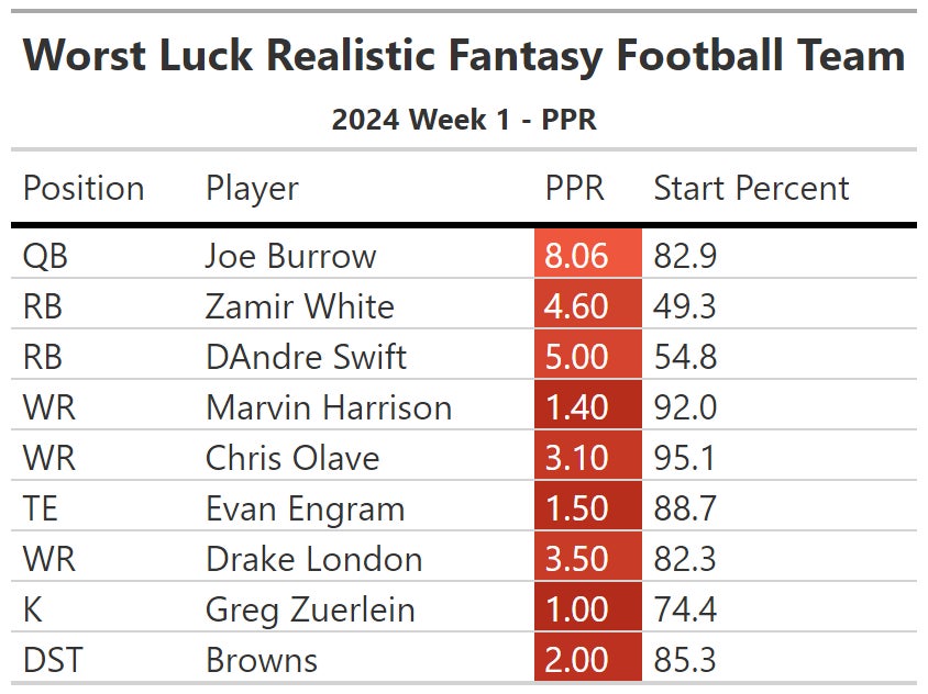 That's good for a first week. Will be back for Week 2. Let's end with a little competition. I ran some code to assemble the worst possible fantasy team in PPR. Only players started in 30 percent of leagues or more are eligible so we have a realistic squad. How many out of nine did you start? Highest score wins the competition so at least you can be a winner of something.