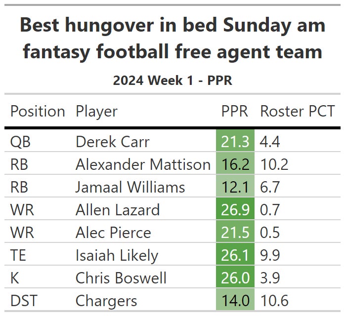 Now to twist the knife on anyone who's team was a major dud, here's a team assembly you could have picked up on the waiver wire Sunday morning (or technically Thursday for Likely, whatever).