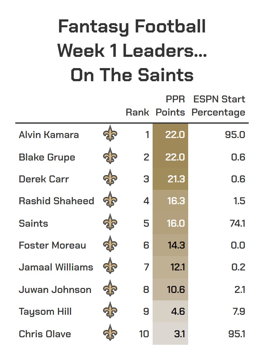 Chris Olave - 2/2 for 11 yards. In fantasy leagues that only allows starting players on the Saints, Olave would be the 10th highest scoring player.