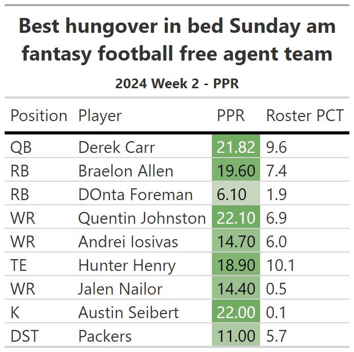 My advice after two weeks is this - stay the course. Don't give up too quick. Things should eventually even out. I know this because I'm an idiot and didn't follow this advice by starting Hunter Henry over Dalton Kincaid last night for Week 3. This is a sure sign that Kincaid will go off so you may as well benefit from my failure. Definitely putting both of these guys on my Troll of the Year watch board.