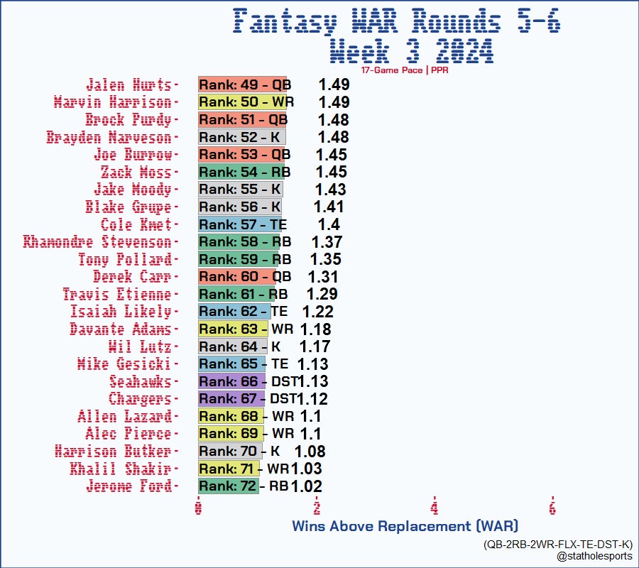 Jalen Hurts has been a disappointment so far but I think when AJ Brown gets healthy he'll be fine. Wouldn't hate buying low there. Also going to be honest I just noticed the name Brayden Narveson for the first time ever after making the graph. I have no clue what team he plays for but I don't even feel like looking it up. That way I can assume he is a kicker on some team, and not some wild error in my data.