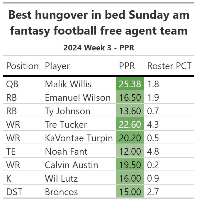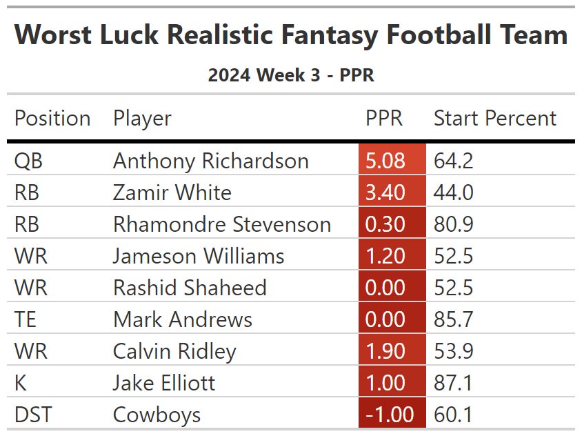Had a rough week? Benched Dalton Kincaid for Hunter Henry? Well let's have a little perspective and compile the worst possible realistic team from Week 3 (any player started in 30% of leagues or more). Here's an astounding 11.9 PPR effort from this Longest Yard like compilation of compost.
