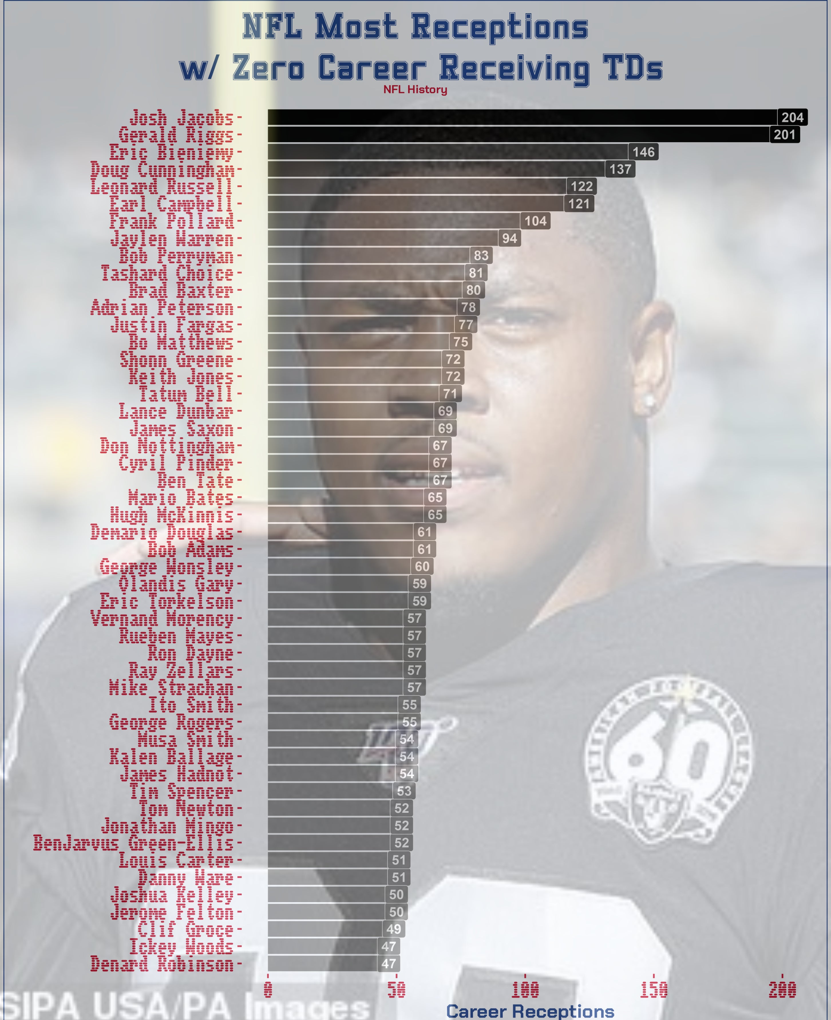 Sad Stat #4 - Josh Jacobs is now your OFFICIAL "Most catches in NFL History without scoring a receiving touchdown" leader