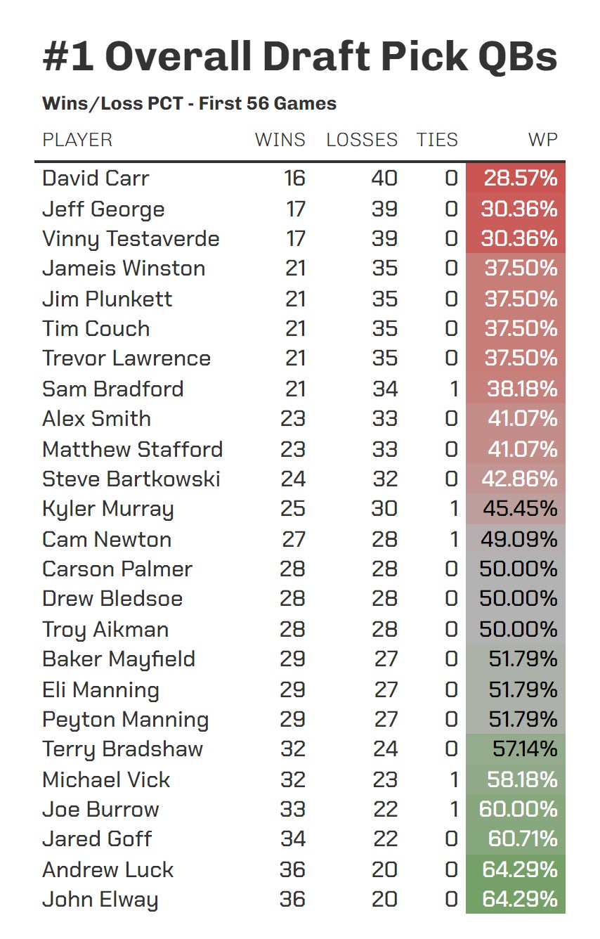 But I guess you could still say there's hope. Here's a list of every quarterback drafted #1 overall in order of win percentage in their first 56 games played (including playoffs).