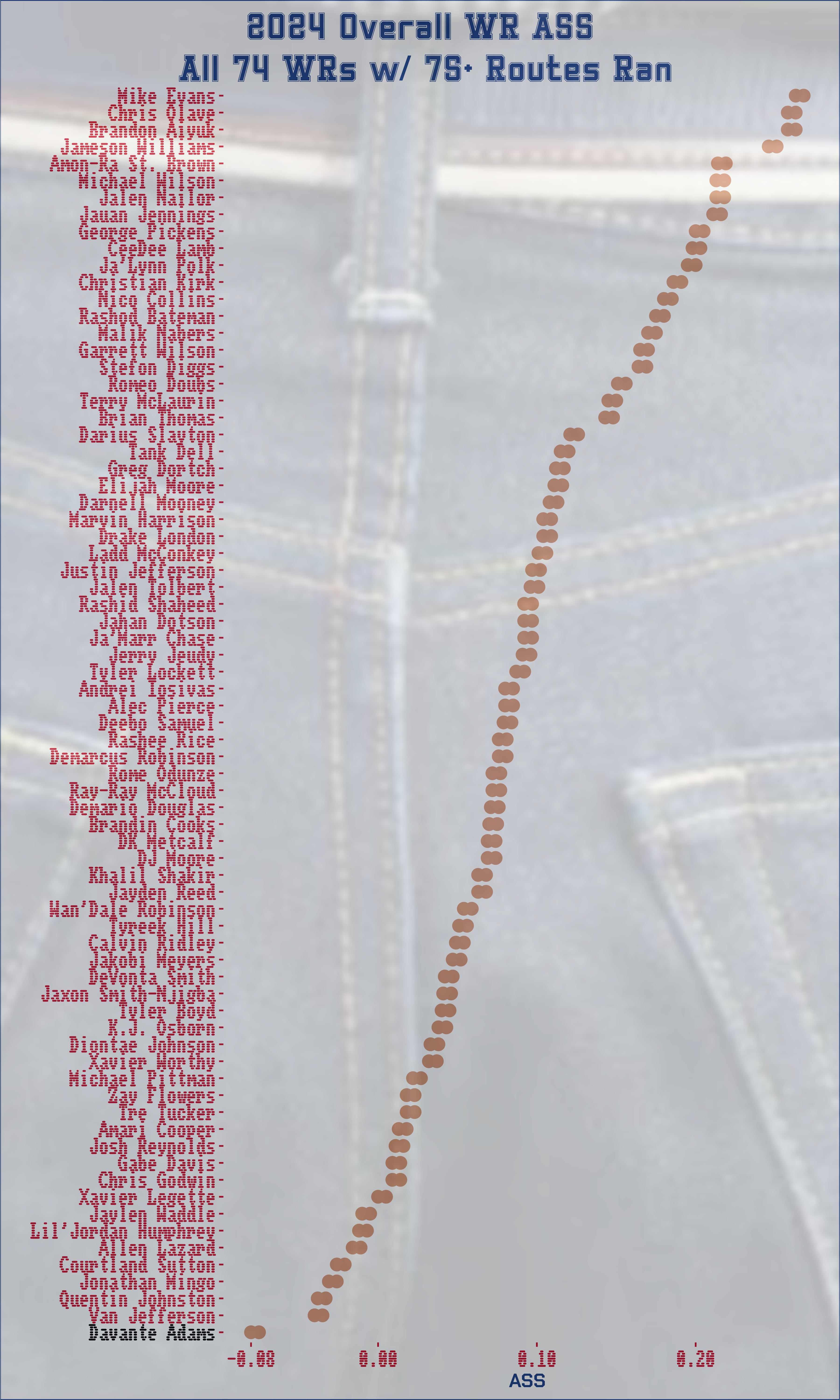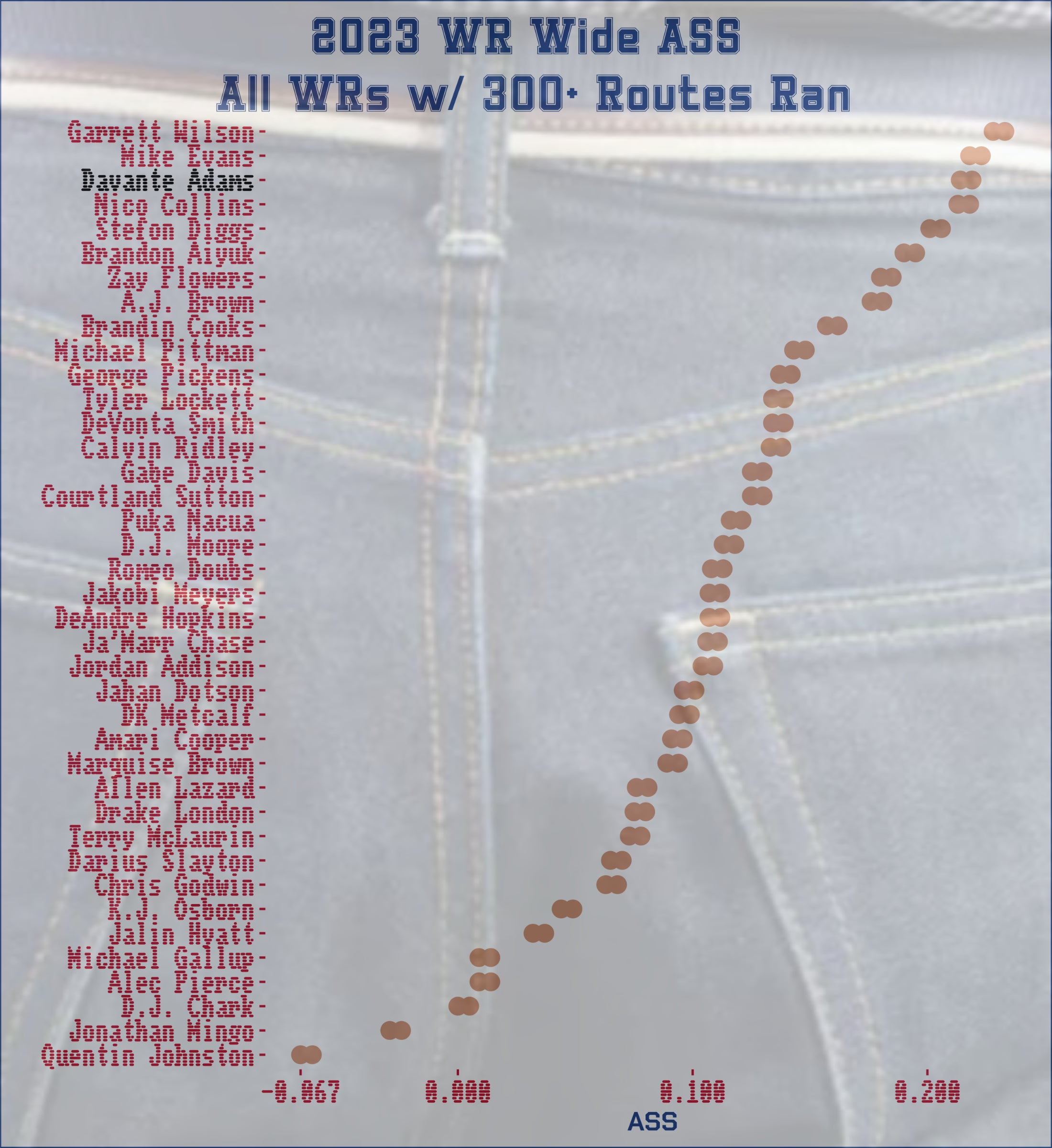 I checked in with Scott to see if maybe the reason for this was that no one else on the team is a threat resulting in him getting double teamed. Not the case. "He's checked out bro" - is the quote I was given from the official "ASS charters" of this stat. This tracks as Adams was highly productive in 2023. Even with AOC at the helm with little else to throw to, Adams was sturdy amongst the most robust ASS's: