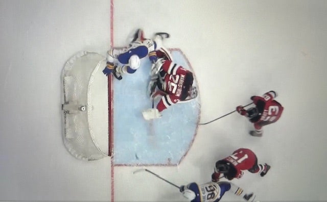 This biggest weak spot for the New Jersey Devils in recent years (other than shit-talking fans who live in Vancouver) has been its crease. Their locker room in the 2020's has seen more pads than the opening scene of CARRIE. But local lad Tommy Fitz swindled Calgary out of its #1 goalie Jacob Markström in June and the Swede paid incredible dividends before the first period of the new season was over when he made this amazing save.