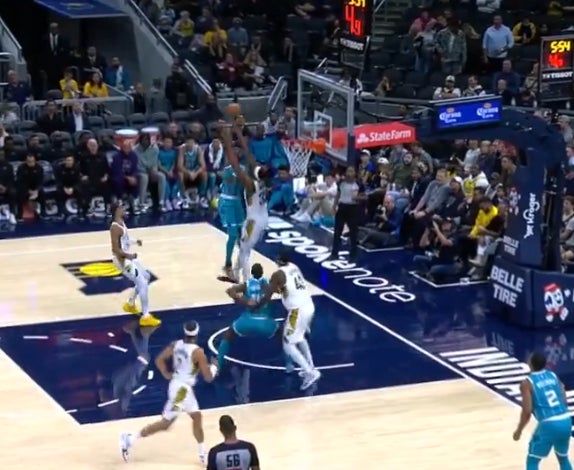 From here, if Miller brings this dunk down with force and has a clean finish, we're talking about an early candidate for Dunk Of The Year no question. But this is where I get stuck, to me, that looked more like a throw-in finish with no contact on the rim. Watch that zoomed-in video again and tell me what you think. I slowed it down frame by frame and I "think" there may be the smallest of contact here