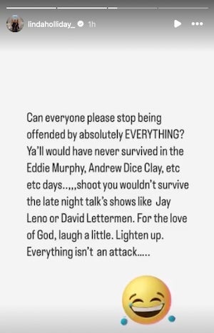 And we can also take pleasure in knowing that the woman in that relationship is still thriving after the breakup. Still a strong, vibrant, beautiful, independent woman who looks incredible in yellow leather. Who holds no ill will toward her ex. Who is still dog mom to their beloved Nike. And who even has it in her to say what needs to be said about the state of American comedy these days. We could use more edgy, irreverent, 1990s-style humor to be sure. And we can use a lot more people with Linda Holliday's attitude. This Halloween and all the Halloweens to come.
