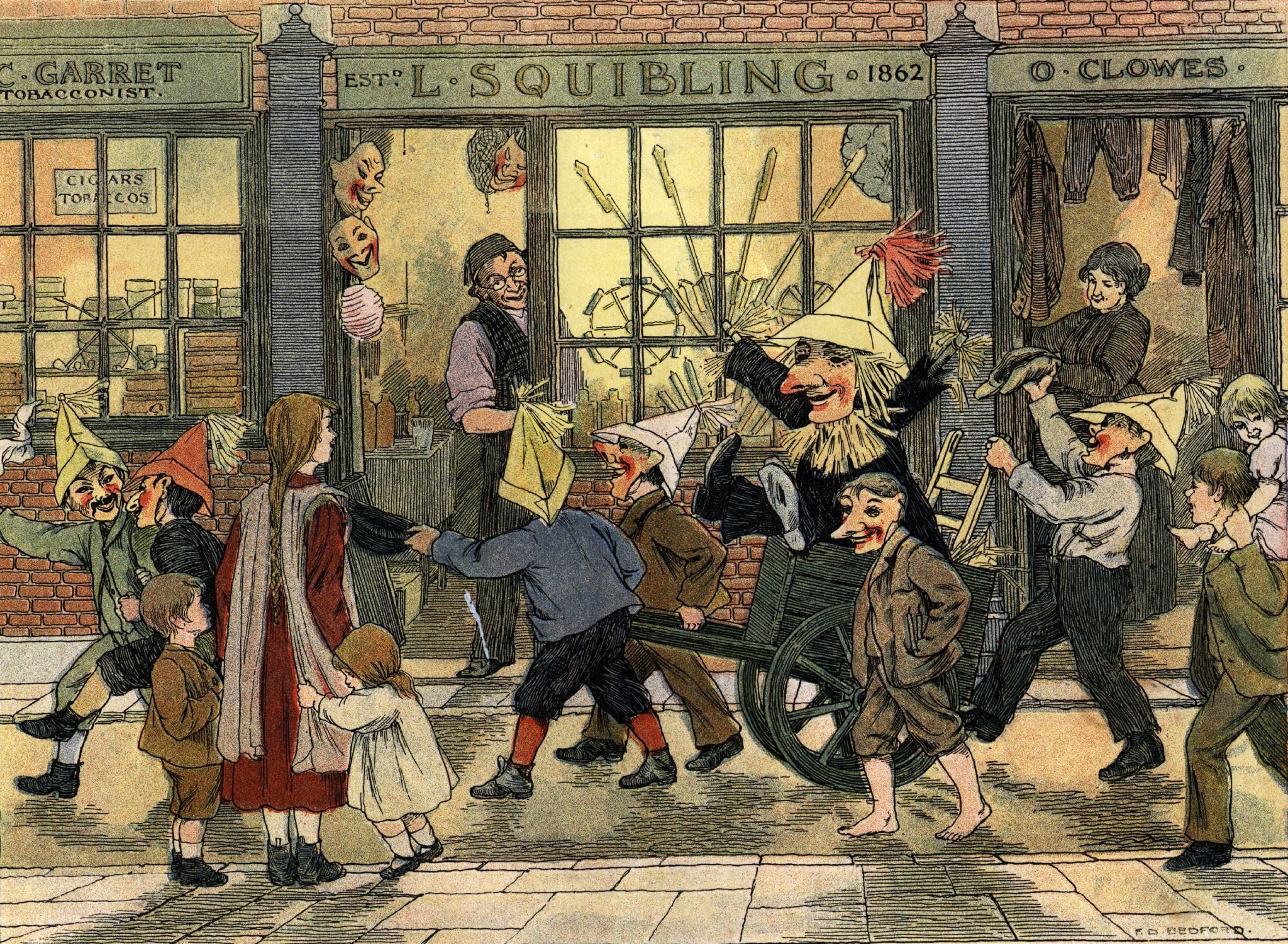On the original Guy Fawkes Day, celebrated immediately after the famous plotter’s execution, communal bonfires, or “bone fires,” were lit to burn effigies and the symbolic “bones” of the Catholic pope. By the early 19th century, children bearing effigies of Fawkes were roaming the streets on the evening of November 5, asking for “a penny for the Guy.”