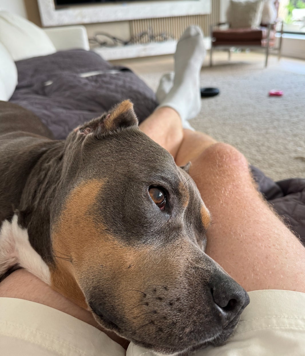 Inside Dave's refreshingly air-conditioned home, we waited on a gigantic couch while Dave wrapped up a podcast. His two famous dogs wagged their tails and Miss Peaches in particular sought scratches in the most endearing way. I've had my struggles with pitbulls over the years but she taught me the error of my assumptions and melted my heart as she napped on my lap: