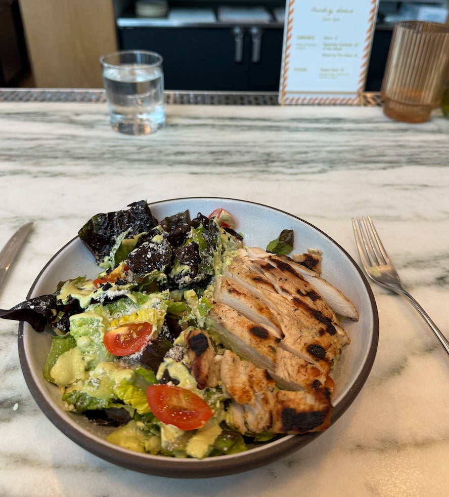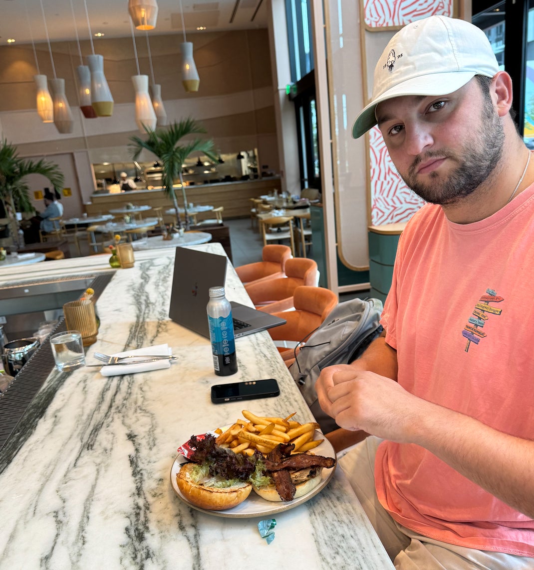 I awoke refreshed and alert, albeit sore from a scorched esophagus. The team was hell-bent on getting a pump in, so we congregated in decent hotel gym for a session of circuits: four sets each of incline shoulder presses with the heaviest dumbells available (50s, pathetic) // seated rows at 160 // close grip pullups x 10 with a final burnout set to failure for a whipped cream topping. Dana "jogged" on the treadmill amid three octogenarian women in golf visors conducting their daily physical therapy. We then retired to our rooms to pound hog before meeting for a light lunch, again, in the lobby bar.