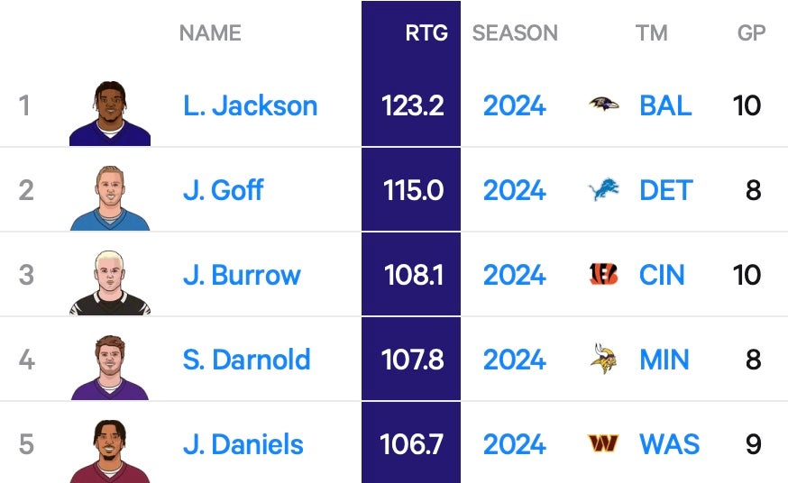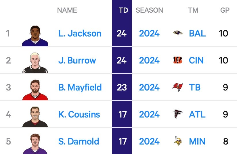 I will say, Baker Mayfield has played 1 less game. So after this week, more likely than not, Lamar Jackson will merely be tied for second in passing TD's. And I know I'm biased. I've always held the highly contentious "Lamar Jackson is good" opinion. But if you give me a shot of truth serum and put a revolver to my head, I'm pretty confident I would still say that the player who is leading the NFL in passer rating, is top 3 in TD passes, top 4 in passing yards per game, and lines up every play behind the center is in fact a quarterback, and not a running back.