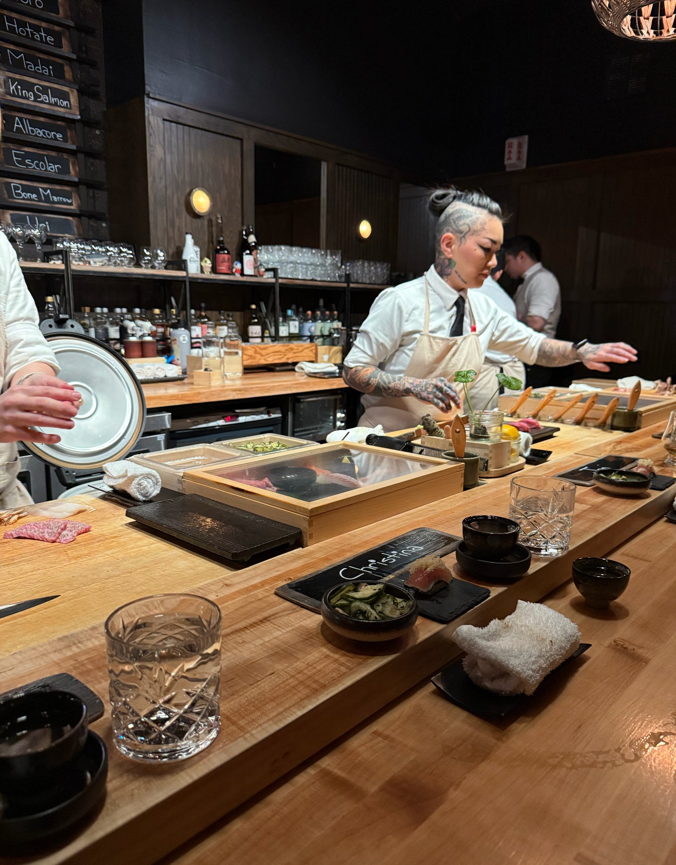 You start upstairs with two amuse-bouche courses (fancy foodie talk for “little bites that make you realize your palate is a child”), and then you get escorted down to the main event: a 10-seat sushi bar where three chefs and a bartender take care of you like you’re the only guests they’ve ever had.