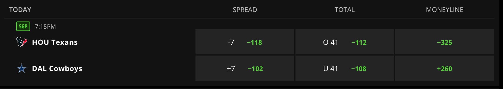Tonight on Monday Night Football we've got the 6-4 Houston Texans at the 3-6 Dallas Cowboys +7 (41)